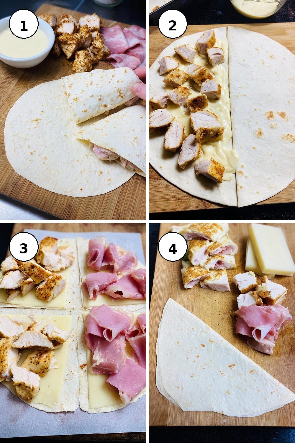 - Put the ham and swiss on the other two fourths of each tortilla, you may need to cut them to fit.