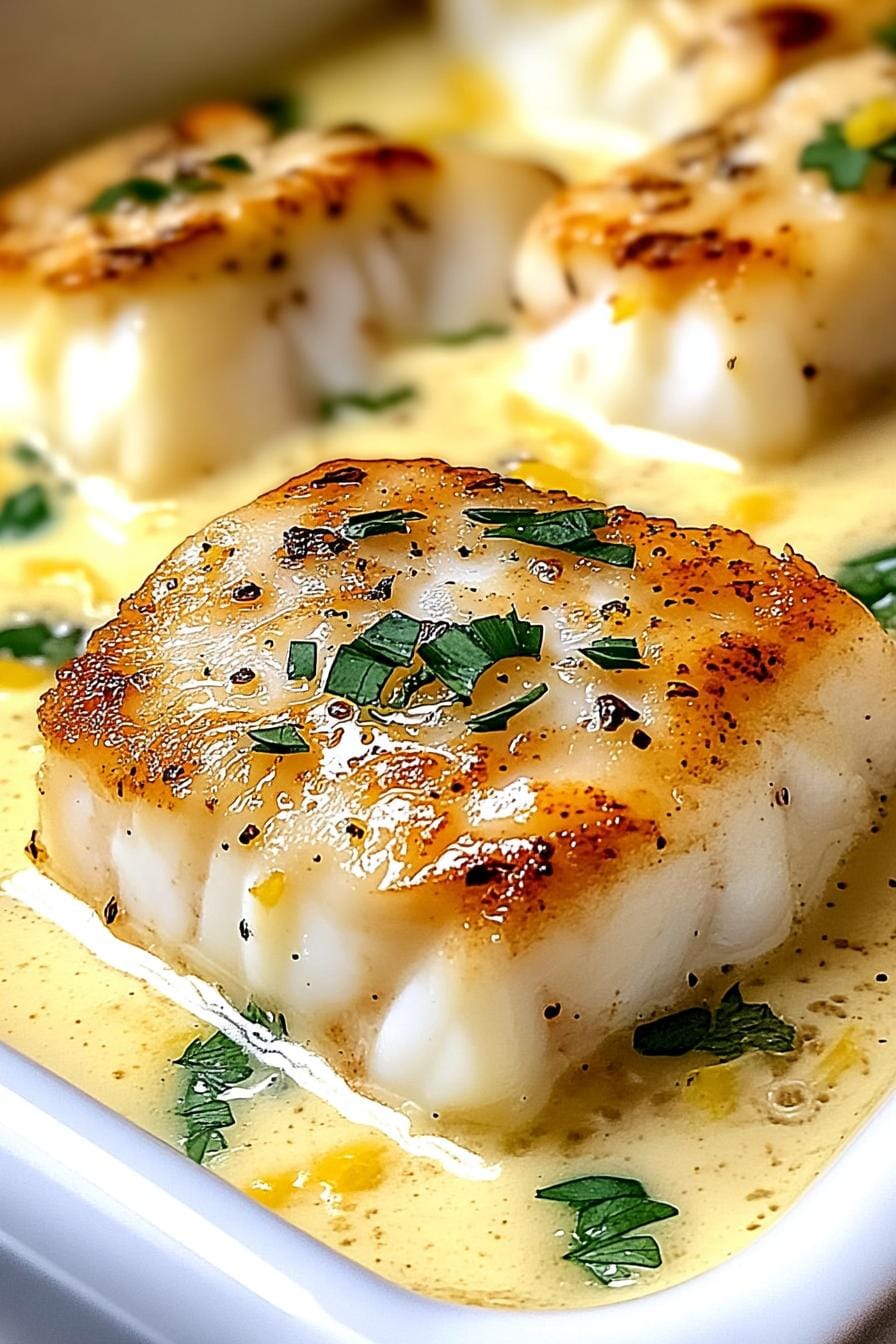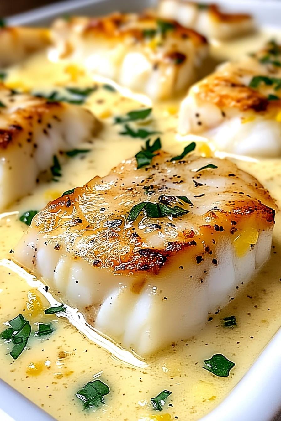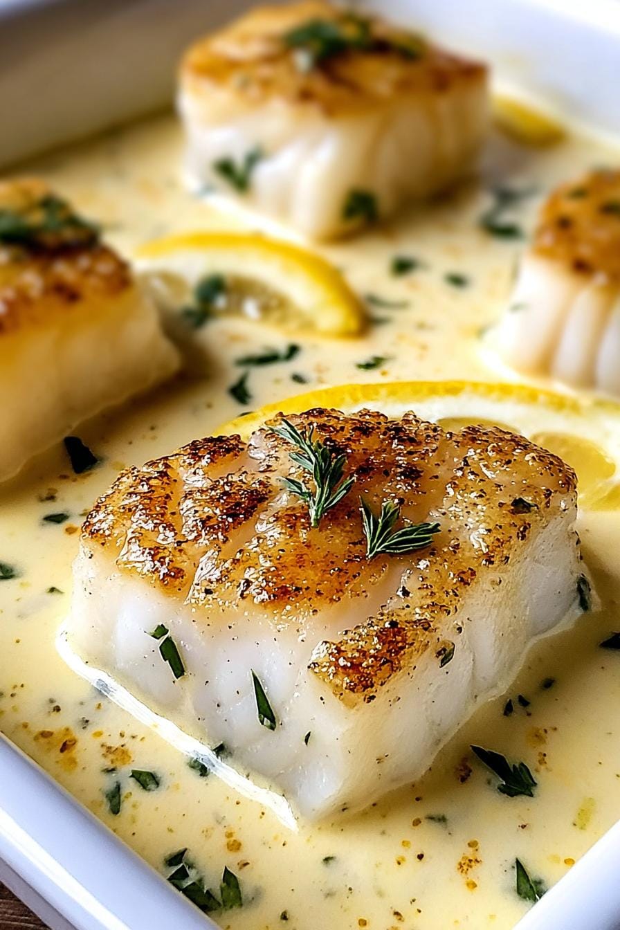 - Visual appeal: golden edges on cod contrast with a glossy, pale sauce