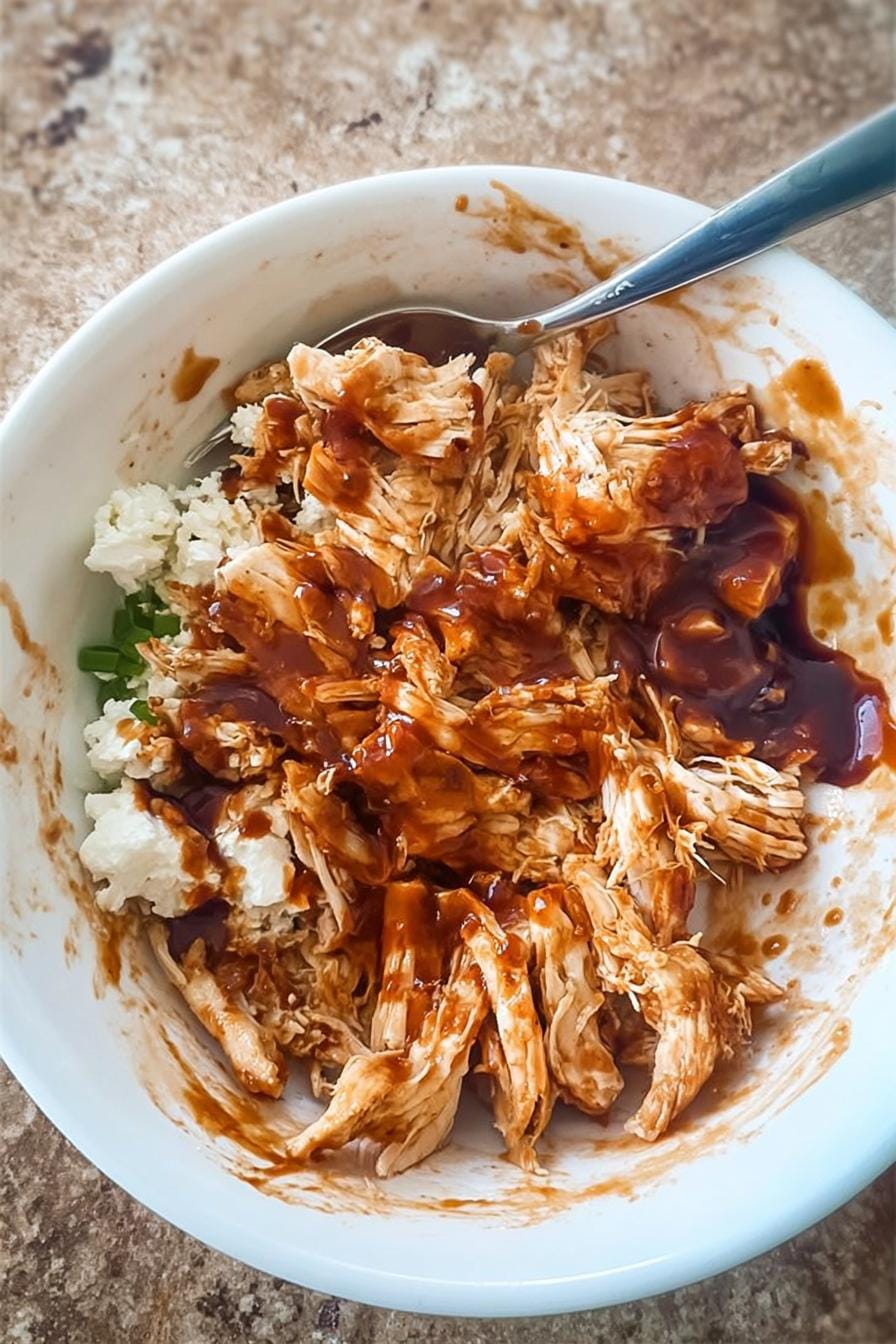 - Add cooked shredded chicken and BBQ sauce; stir until heated through.