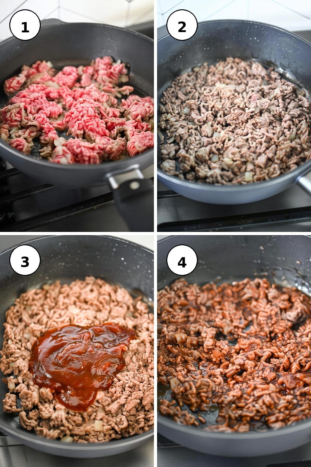- In a large skillet, add the ground beef and onions. Sauté until the beef is browned and no longer pink, about 7-10 minutes. This will fill your kitchen with a savory aroma.
