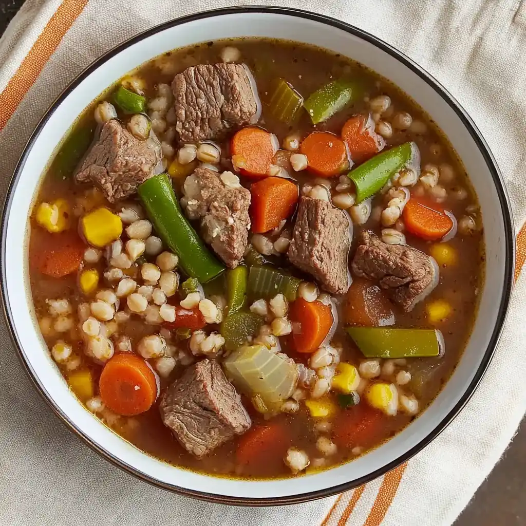 - Simmer gently: Lower the heat, cover, and let the soup simmer for 45–60 minutes until the beef is fork-tender and barley is cooked.