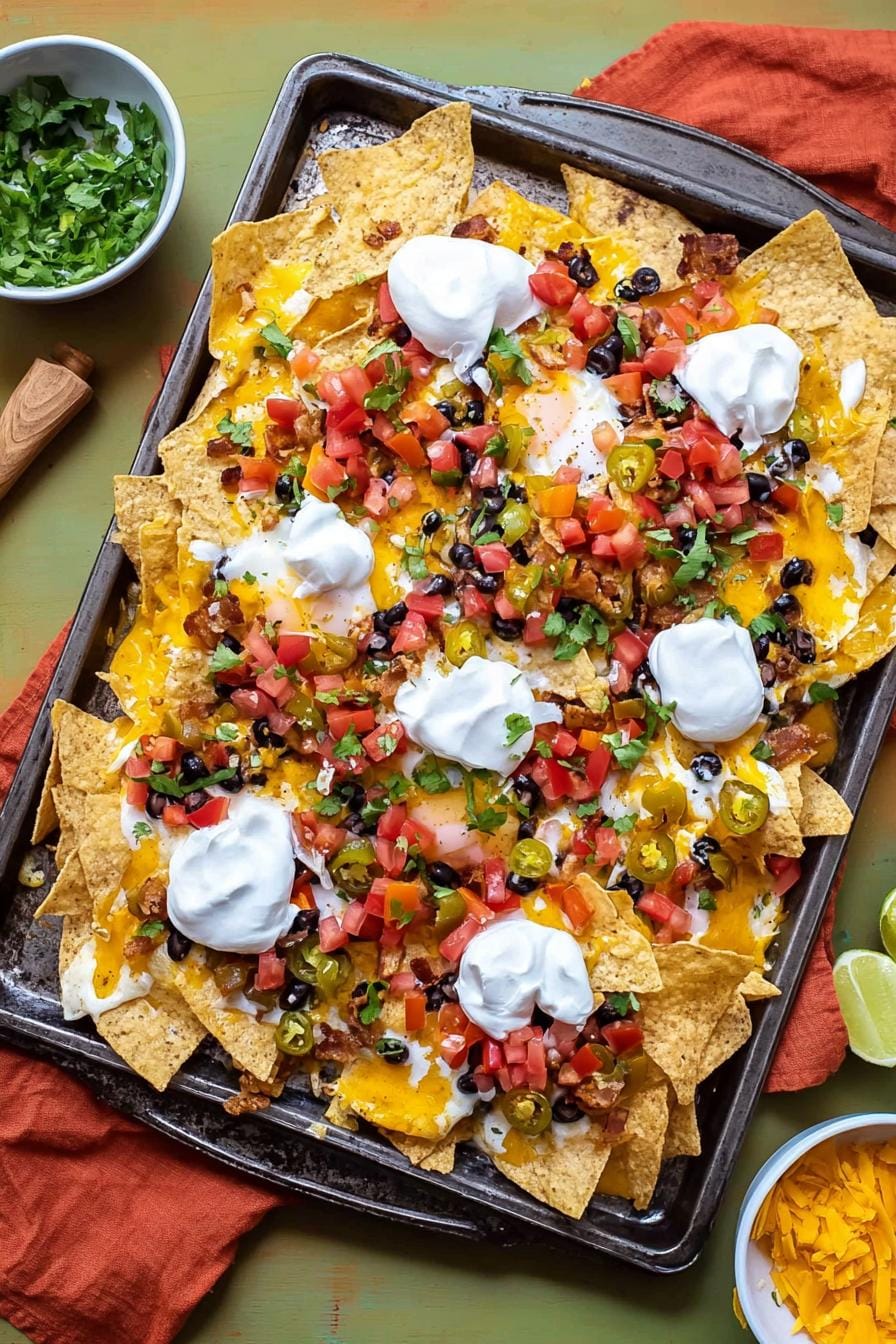 - Remove the nachos from the oven and top with the remaining fresh ingredients: tomato, onion, jalapeño, and sour cream. Serve hot.