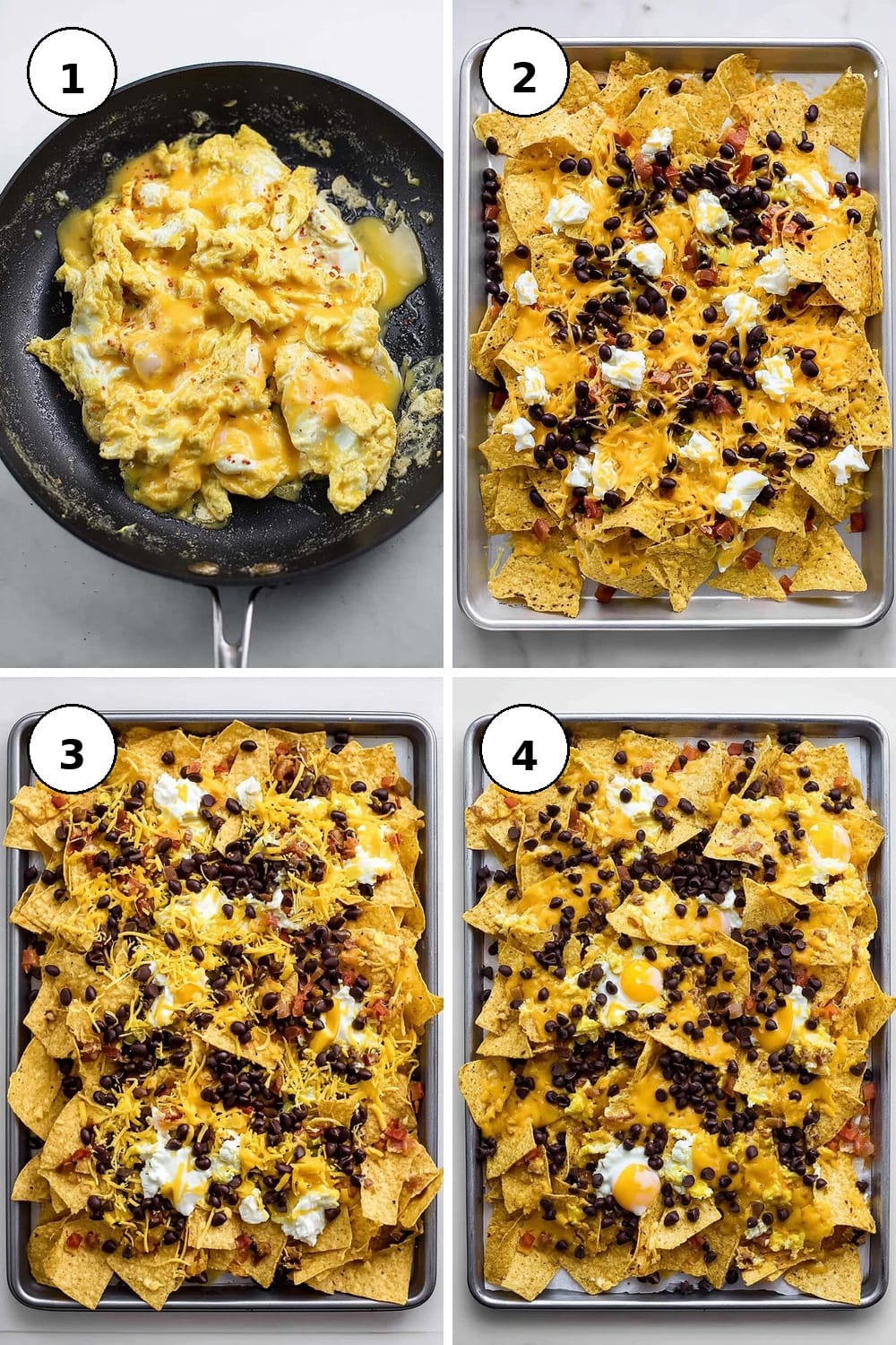 - Line a large baking sheet with parchment paper. Spread half of the tortilla chips over the surface, then top with half of the eggs, half of the black beans, and half of the shredded cheese.