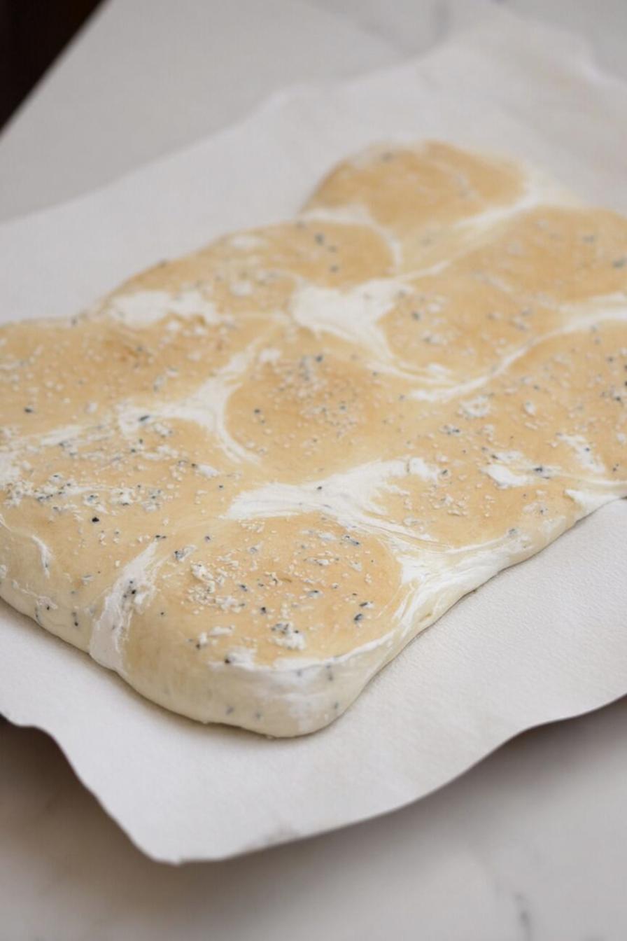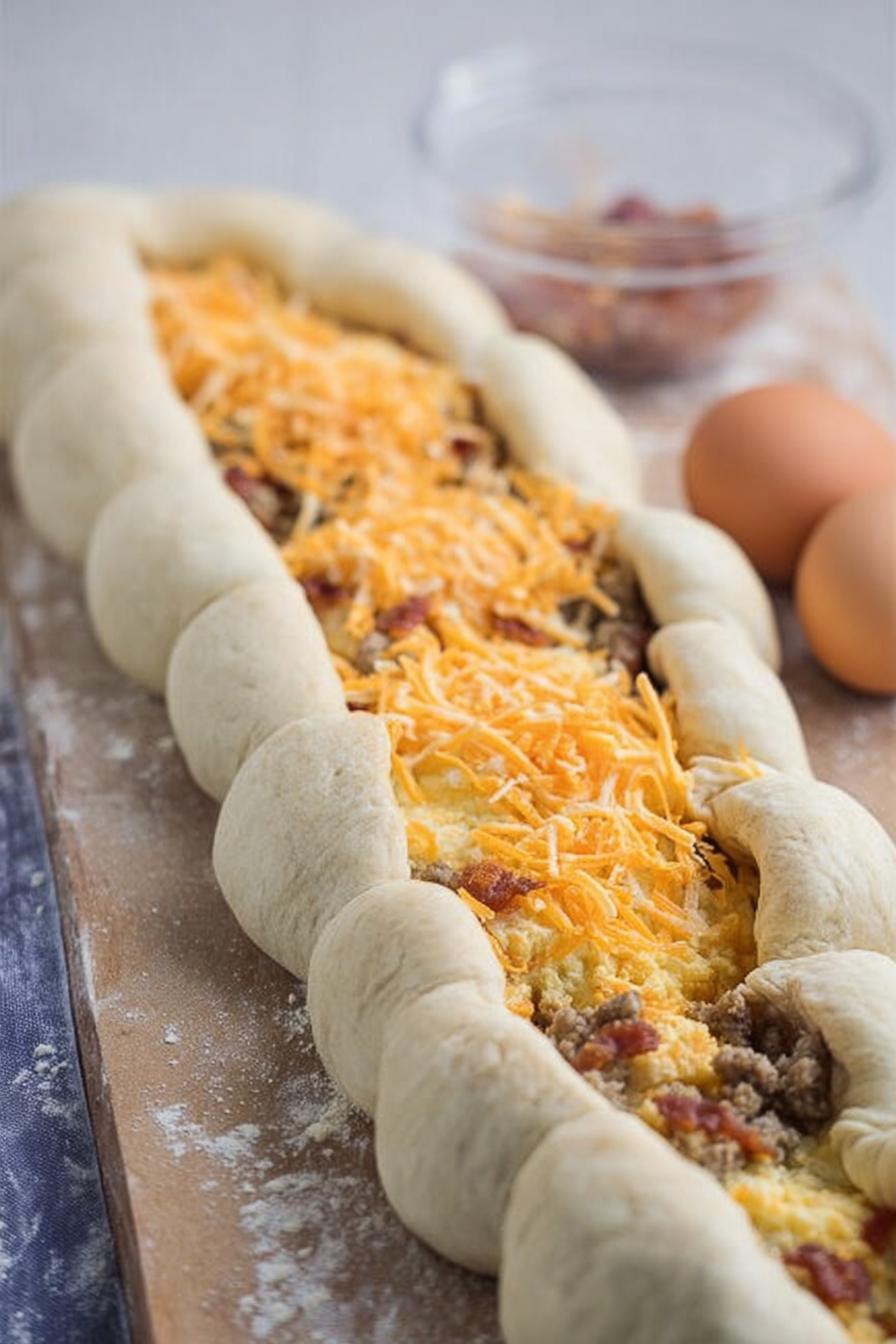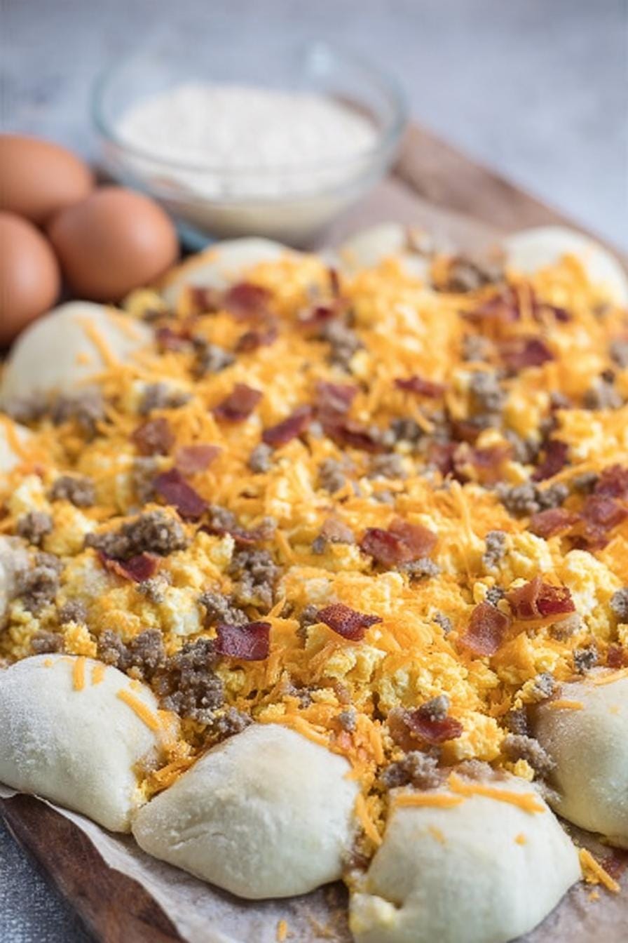 - Spread a layer of cream cheese over the dough, followed by the scrambled egg mixture, cooked sausage, crumbled bacon, and shredded cheddar cheese.