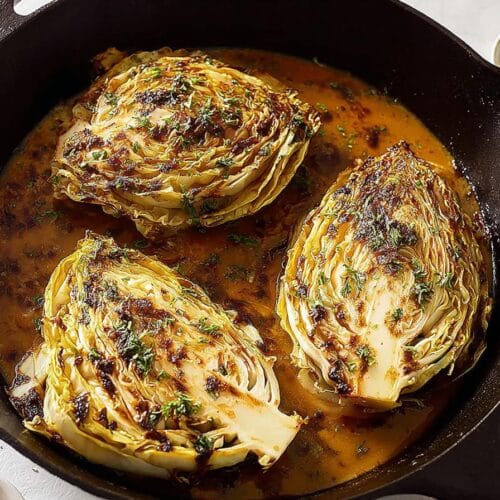 Store leftover Cabbage Steaks in an airtight container in the fridge for up to 4 days. For longer storage, freeze in a single layer on a baking sheet and then transfer to a freezer bag for up to 3 months. When reheating, the oven works best to maintain that roasted quality; 15-20 minutes at 350°F should do the trick. I found that reheating in the skillet restores the stakes’ crispiness!