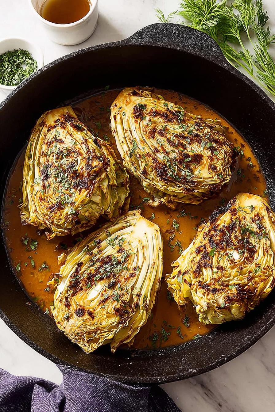 - Once the cabbage is seared, carefully pour the marinade into the skillet and transfer it to the oven. Bake for 25–30 minutes until the cabbage is tender, with edges that begin to wilt and darken.