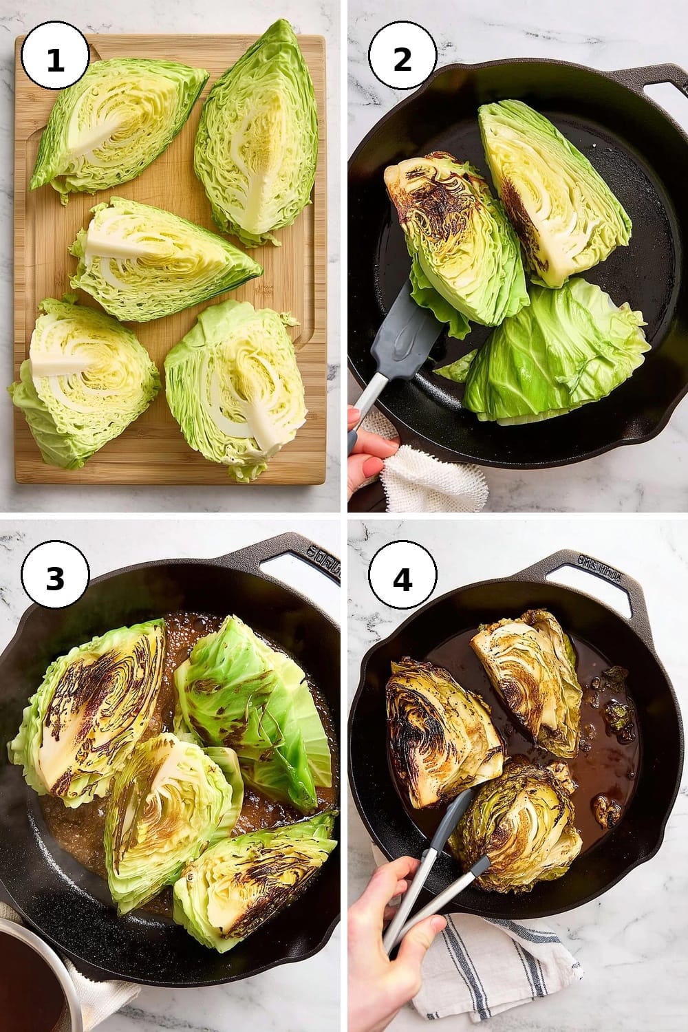 - In a hot cast-iron skillet, add canola oil and sear the cabbage wedges until they are deeply browned on both sides, about 5 minutes each.