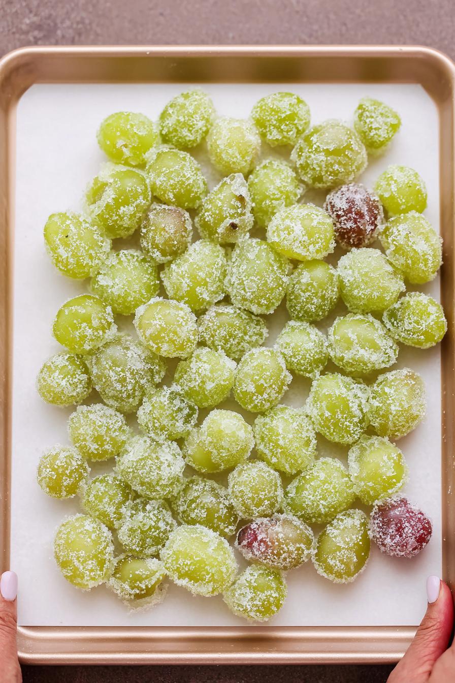 - Dip each grape in the syrup and place on a parchment-lined baking sheet.