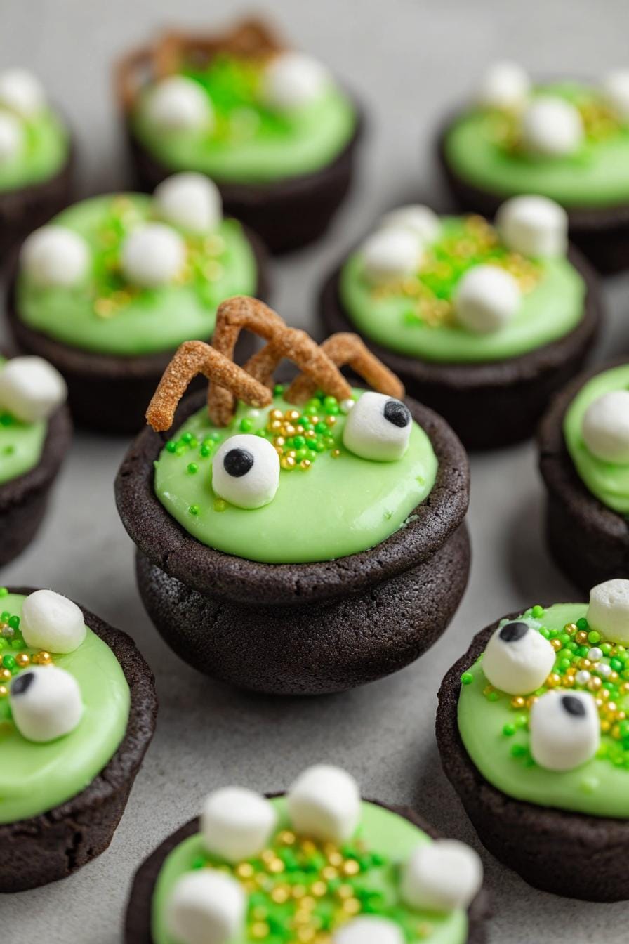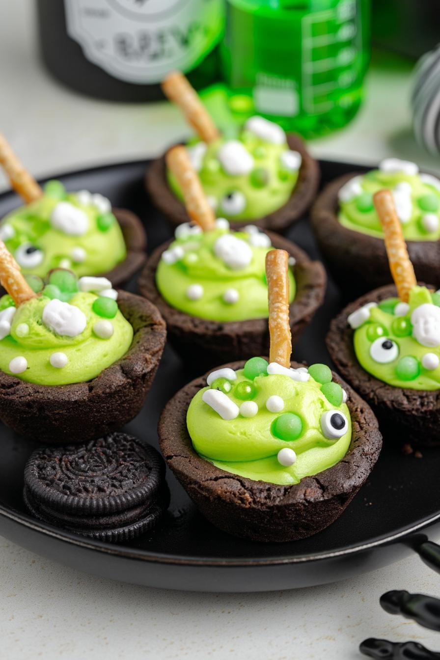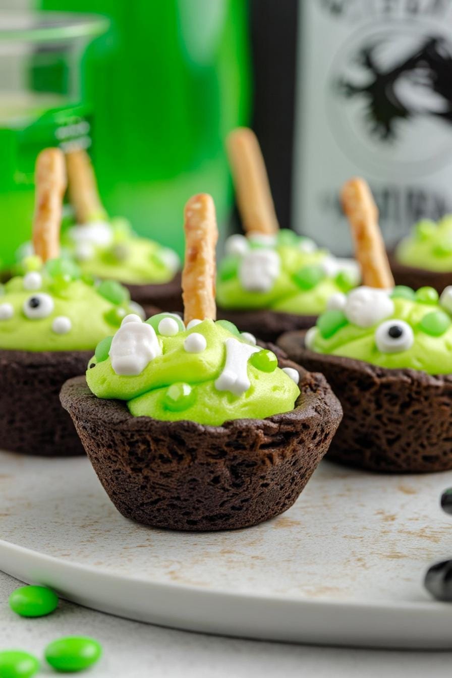 Arrange Cauldron Cookies around a steaming pumpkin spice latte or serve alongside vanilla ice cream for contrast. For a playful spread, tuck in gummy worms so they appear to crawl from each chocolate cup. They pair beautifully with a nutty oolong tea to cut the sweetness.