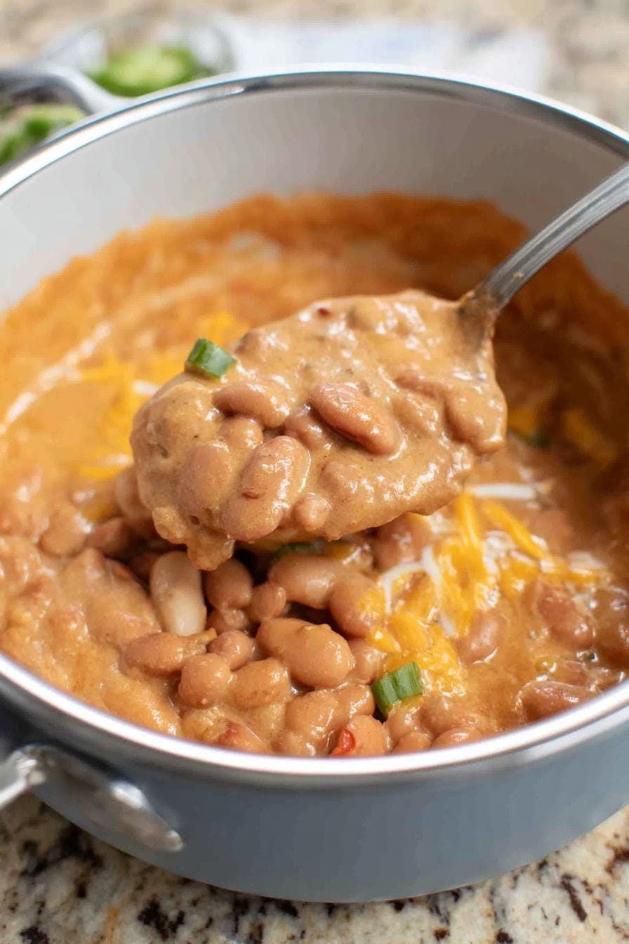 - What can I serve with Cheesy Pinto Beans? They’re fantastic as a dip or served over rice, grilled meats, or with garden salads.