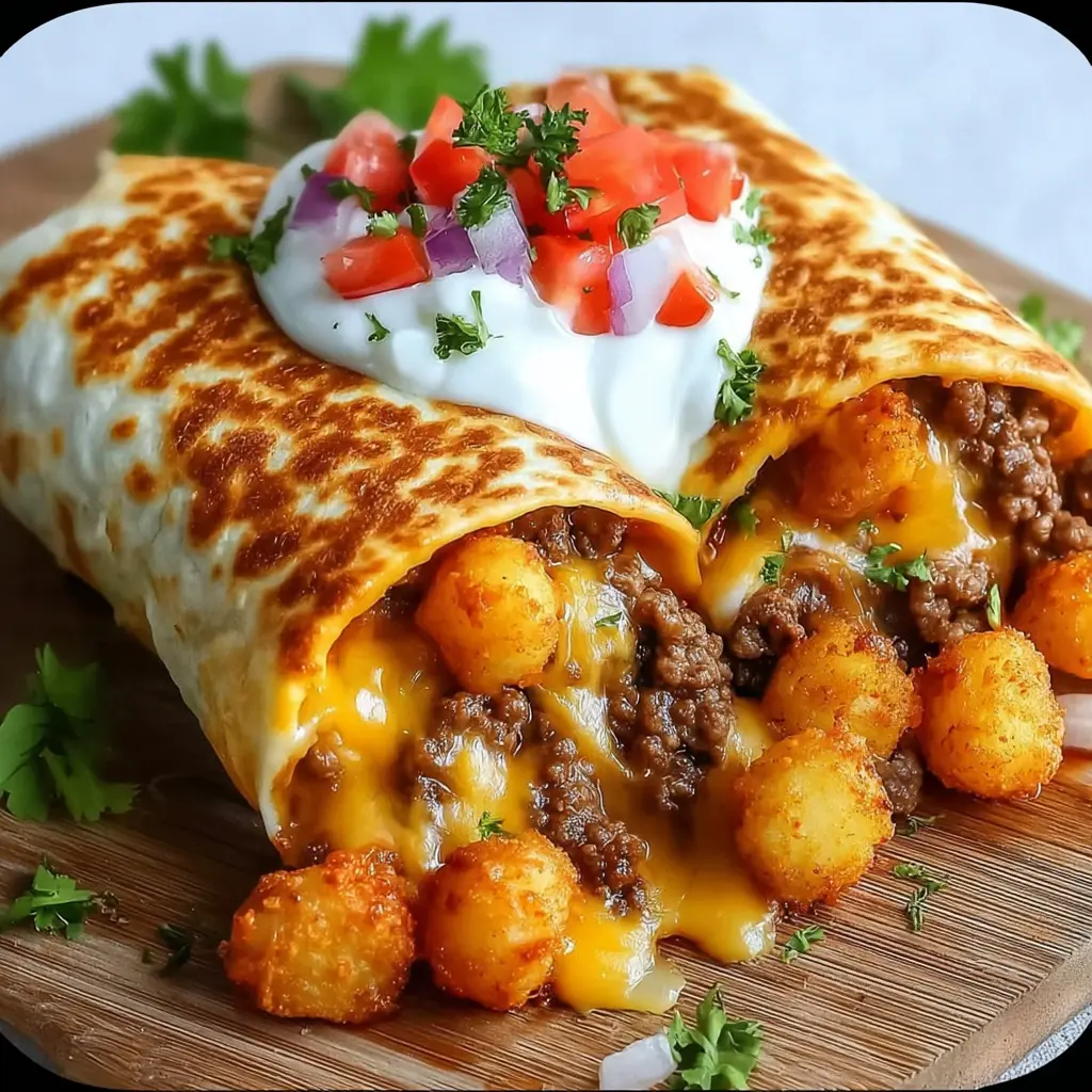 - Assemble: Lay a tortilla flat and layer on ground beef, a handful of tater tots, and shredded cheese. Add sour cream and diced tomato if using.