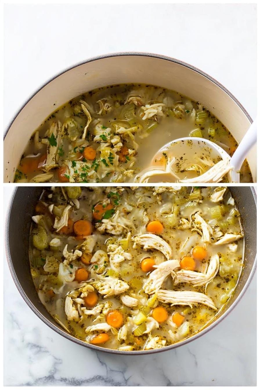 - Broth that’s richly flavored yet light, thanks to a precise sauté of onion, carrot, and celery