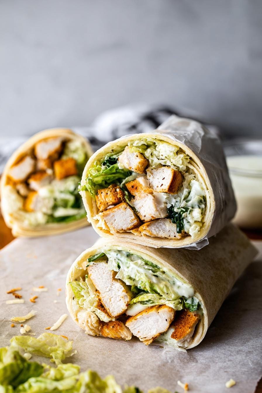 Serve your Chicken Caesar Wraps alongside a light green salad for a refreshing contrast or some homemade baked sweet potato fries for a comforting touch. You might also enjoy these with a Greek Salad or classic Tomato Soup.