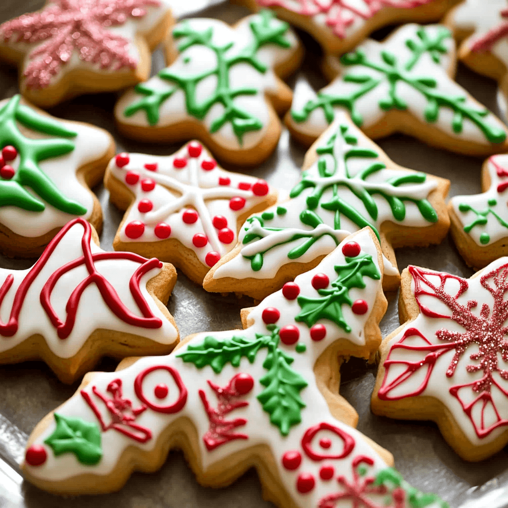 - Decorate – Prepare royal icing in red, green, and white. Pipe designs onto cooled cookies and let them set before serving.