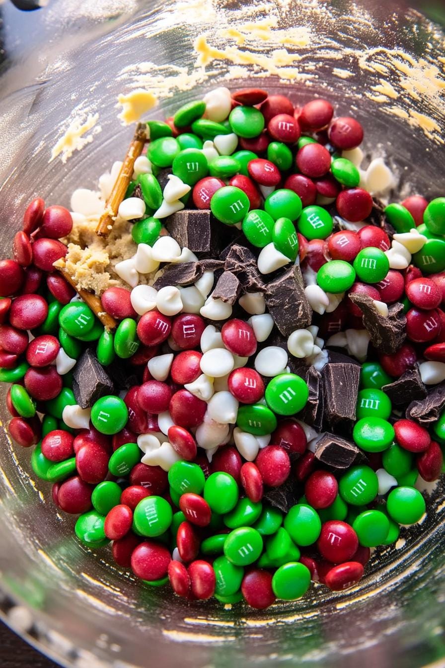 - Fold in the oats, Christmas M&M’s, chocolate chips, peanut butter cups, pretzels, and peanuts.