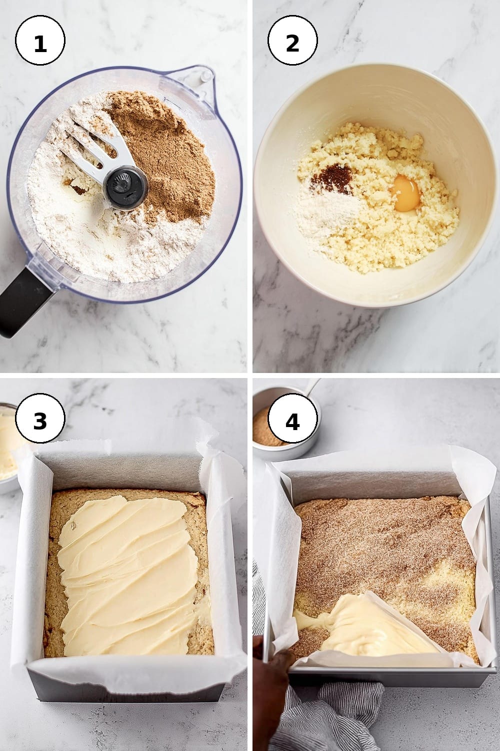 - Preheat the oven to 350°F. Start by making the crumb mixture. In a food processor blend together the all-purpose flour, brown sugar, and cinnamon. Then cut the cold butter into cubes and add it to the processor. Pulse the butter with the rest of the ingredients for just a few seconds until the mixture is crumbly. No need to over-pulse. You’ll want some large and small crumbles. Set the crumb mixture to the side.