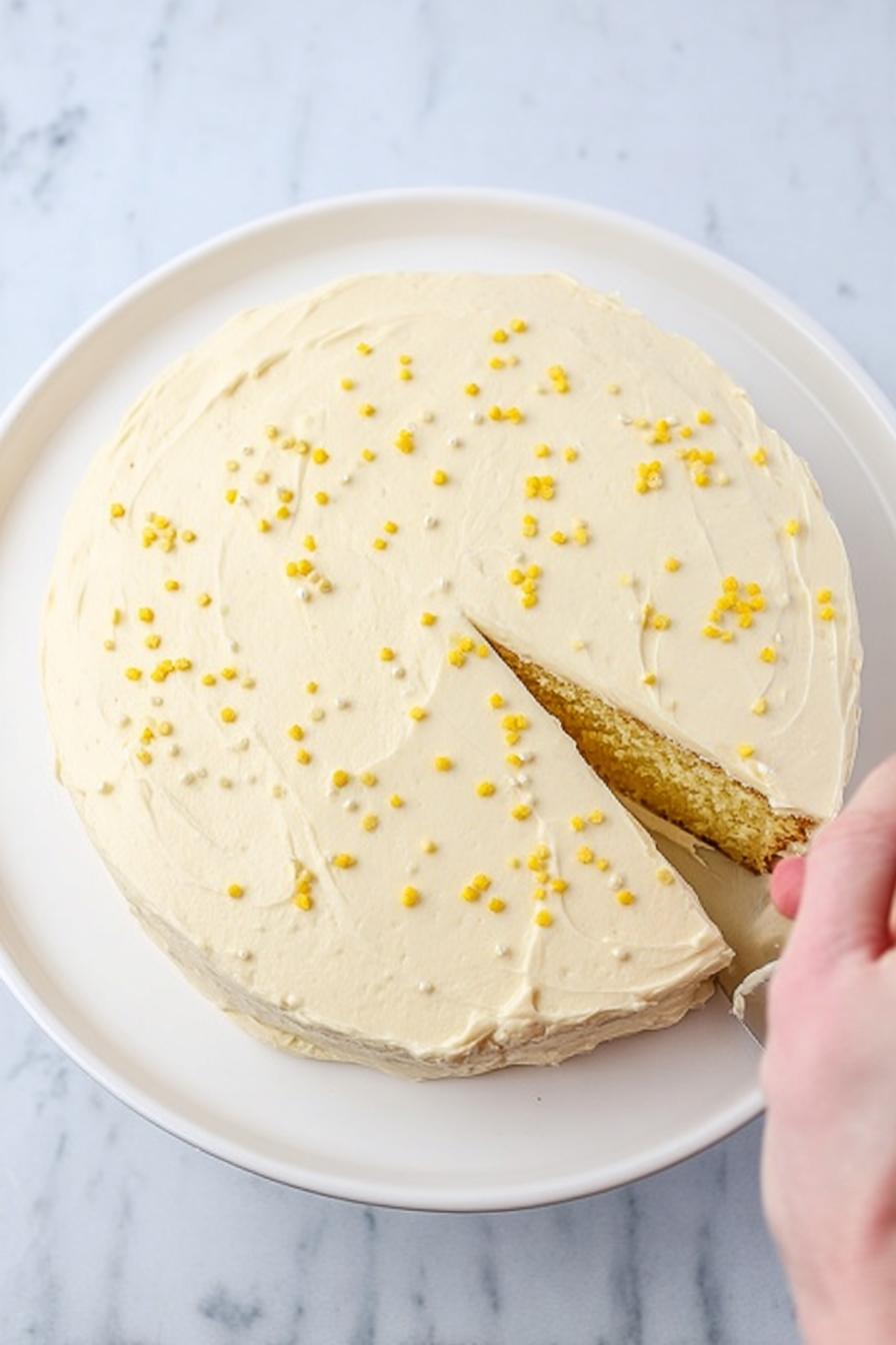 - Once cooled, frost the cake generously and if desired, adorn with sprinkles that remind you of kernels.