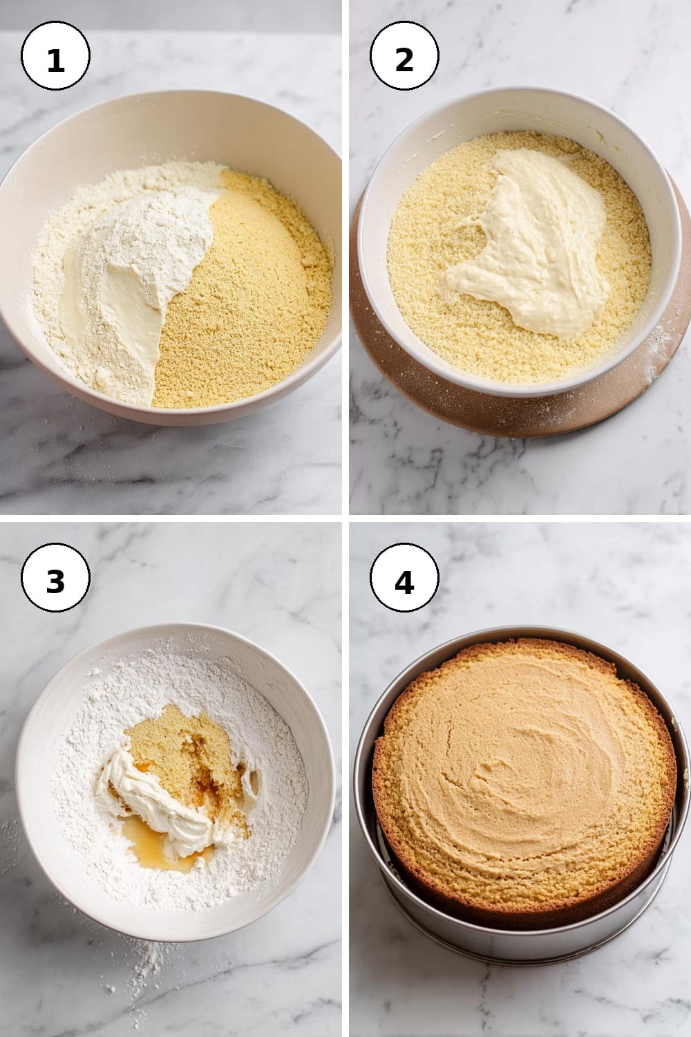 - Combine flour, yellow cornmeal, baking powder, and salt in a large mixing bowl. Whisk to combine.