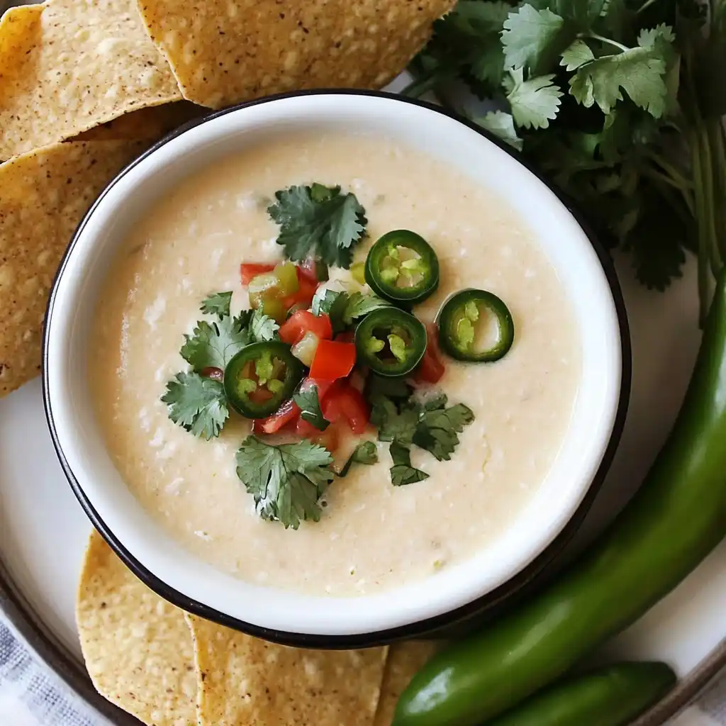 Pour into a serving bowl and top with sliced jalapeños, cilantro, or scallions. Serve warm with tortilla chips or veggie sticks.