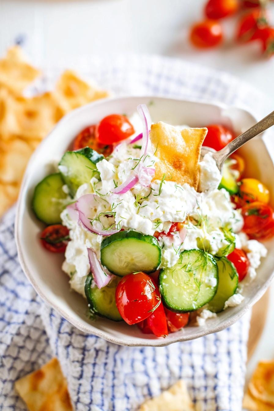 - In a large bowl, combine cottage cheese, cucumber, cherry tomatoes, and red onion.