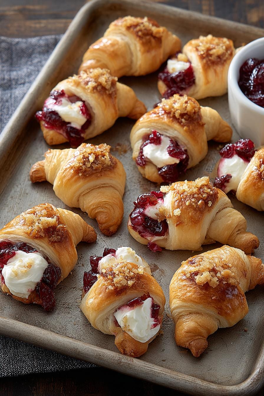 Flaky crescent dough cups filled with a silky vanilla-kissed cream cheese and a jewel-bright spoonful of cranberry sauce. These bite-sized holiday treats come together fast and bake up golden in minutes—perfect for parties, brunch boards, and cozy snacking.