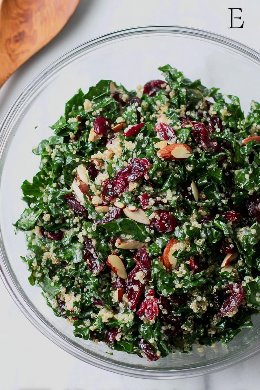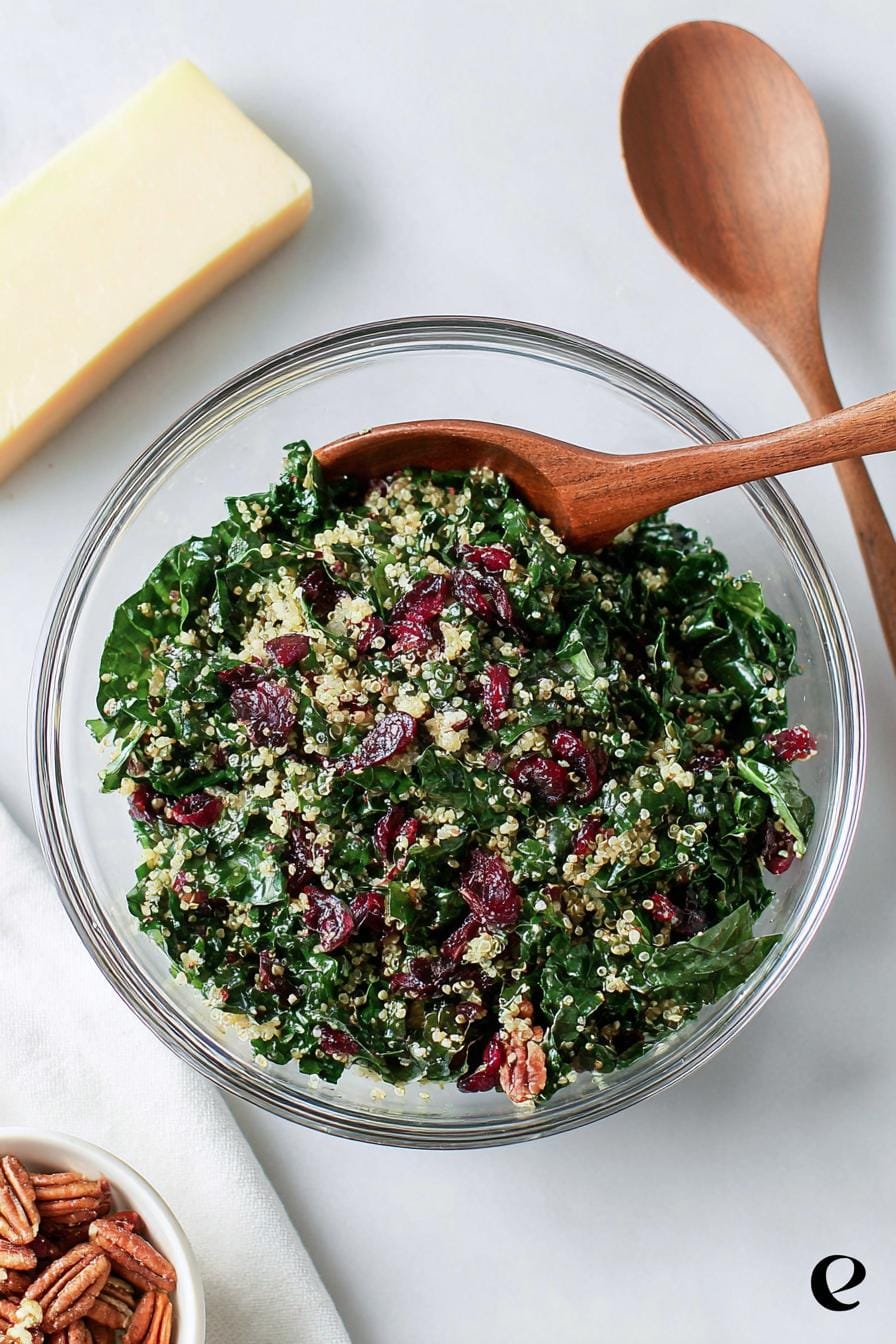 - In a large bowl, combine the cooked quinoa with the kale, 1 cup dried cranberries, and 1 cup crumbled feta cheese. Mix gently to avoid mashing the feta.