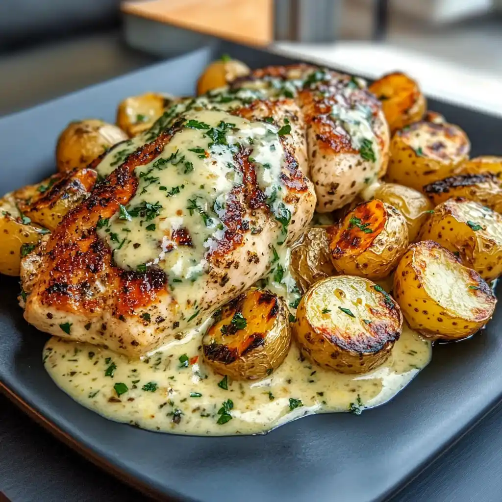 - Incredibly flavorful: The garlic cream sauce is rich, savory, and pairs beautifully with the crispy chicken skin and tender potatoes.