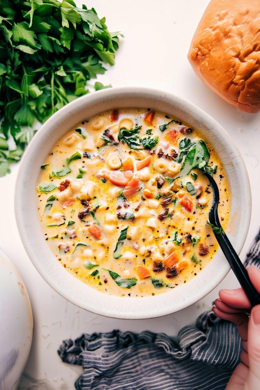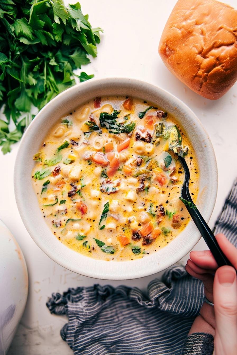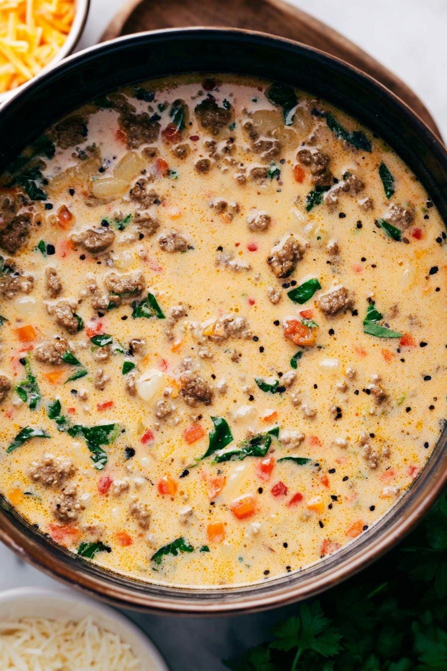 - Lasagna Soup – layers of cheese, sausage, and tomatoes in a comforting bowl