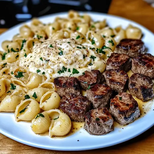 Creamy Parmesan Shells with Garlic Butter Steak Bites Recipe