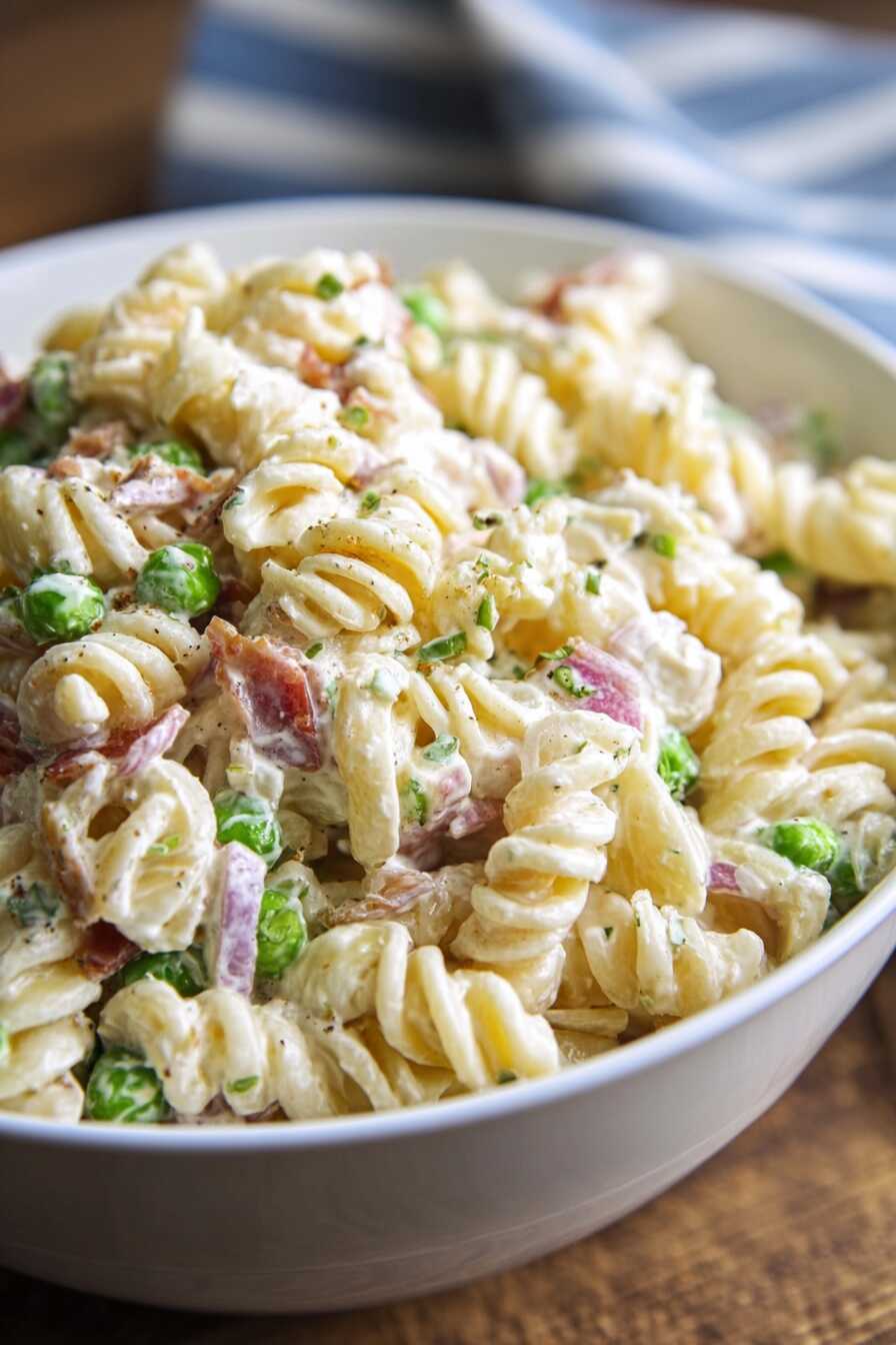 - Combine the pasta, peas, bacon, and parmesan in a large bowl. Pour the dressing over and gently mix until everything is evenly coated.