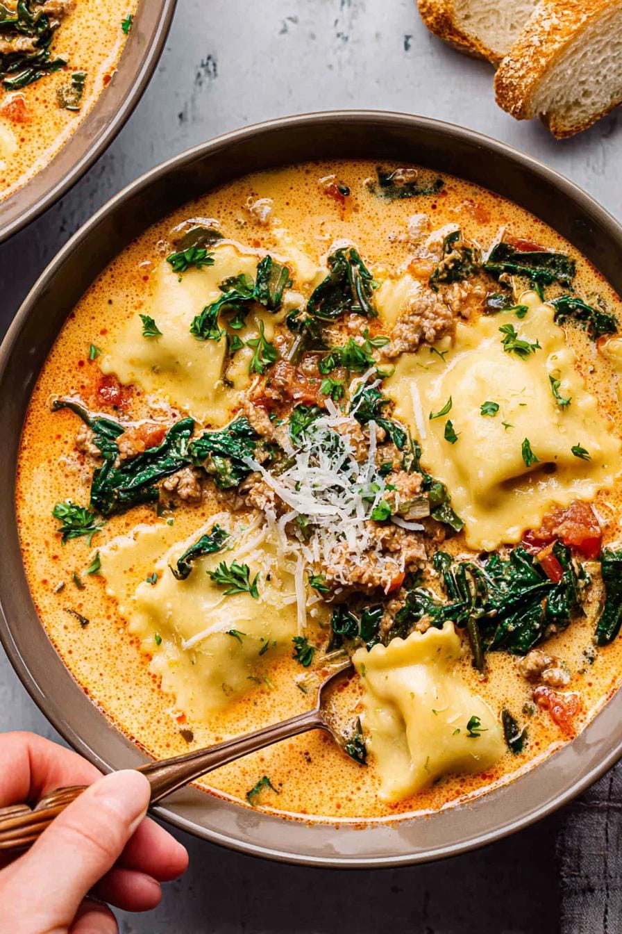 - Can I make Creamy Tuscan Ravioli Soup in a slow cooker? Yes—sauté aromatics on the stove first, then transfer to a slow cooker, add broth and seasoning, cook on low for 2 hours, then stir in ravioli, cream, and spinach at the end.