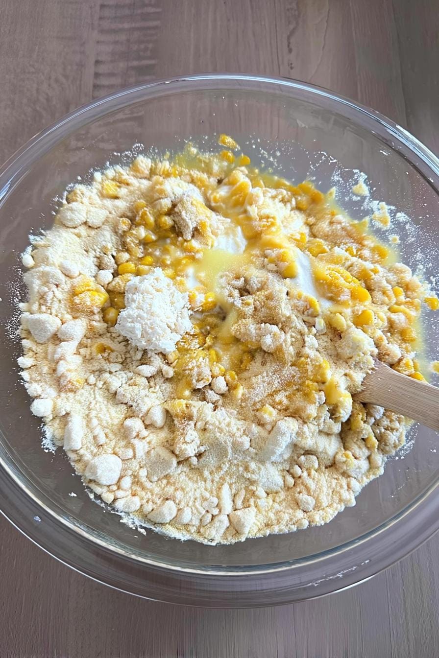 - Fold in cream-style corn and drained kernels gently so you don’t crush them. The mixture should be lumpy with visible corn pieces.