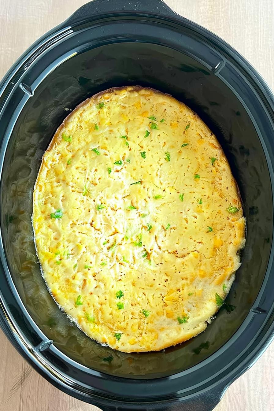 - Pour mixture into the slow cooker and spread level. Cover and cook on low for 3 hours or high for 1½ hours, until edges are golden and center is set.
