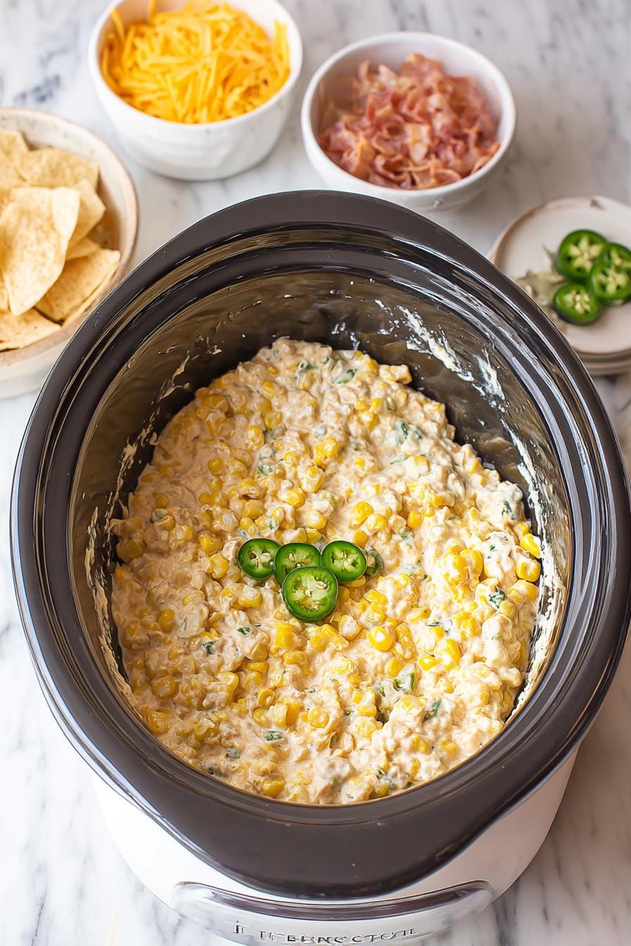 - In your crockpot, combine sautéed jalapenos, corn, cream cheese, and shredded cheddar cheese. Stir until well mixed.