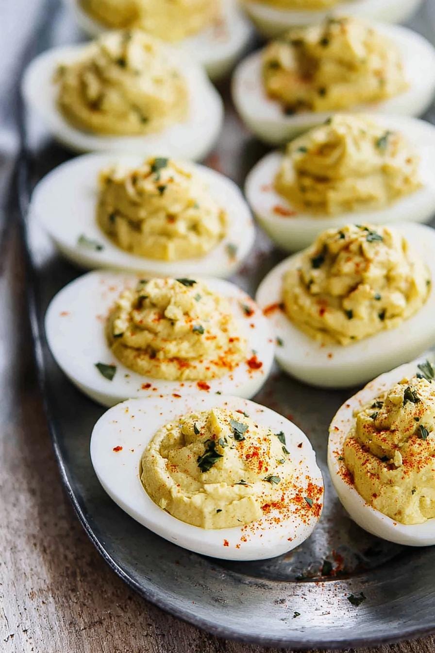Arrange Deviled Eggs on a bed of fresh greens, sprinkle extra paprika or crispy bacon bits on top, and serve alongside crisp crudités or crunchy breadsticks for contrast.