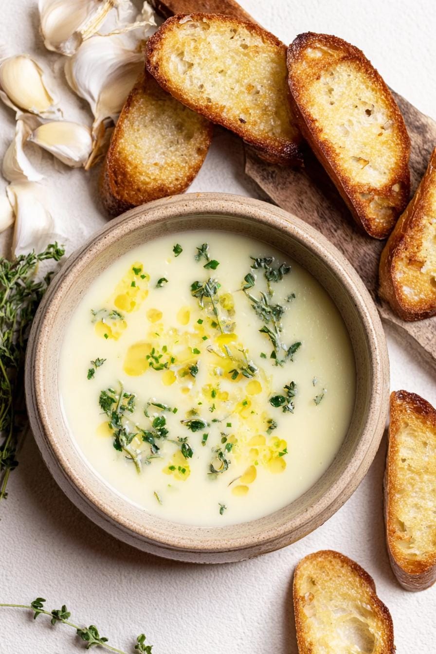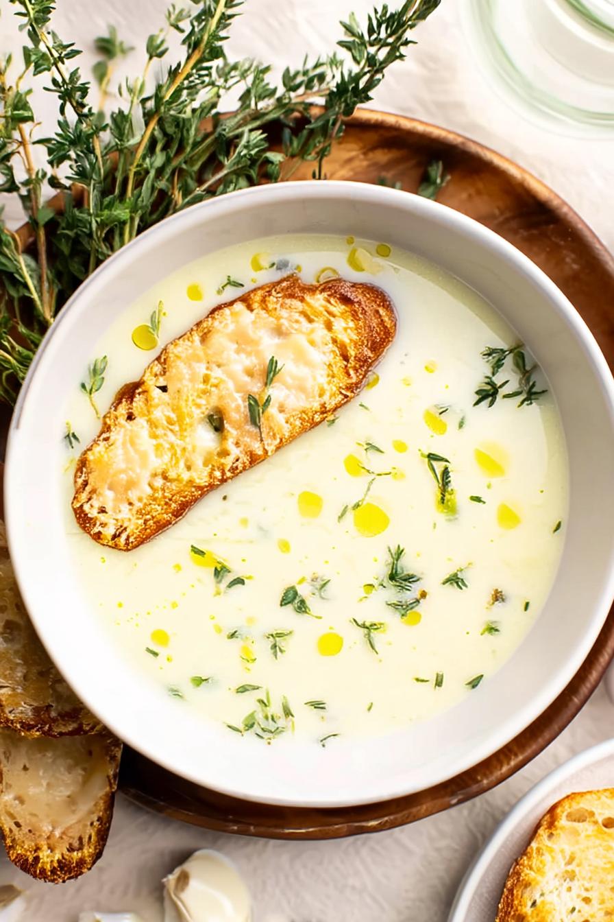 Pair this garlic-rich broth with a crisp green salad dressed in lemon vinaigrette to cut through the richness. A chilled glass of unoaked Chardonnay complements the nutty cheese. For a heartier meal, serve alongside roasted root vegetables sprinkled with fresh herbs.