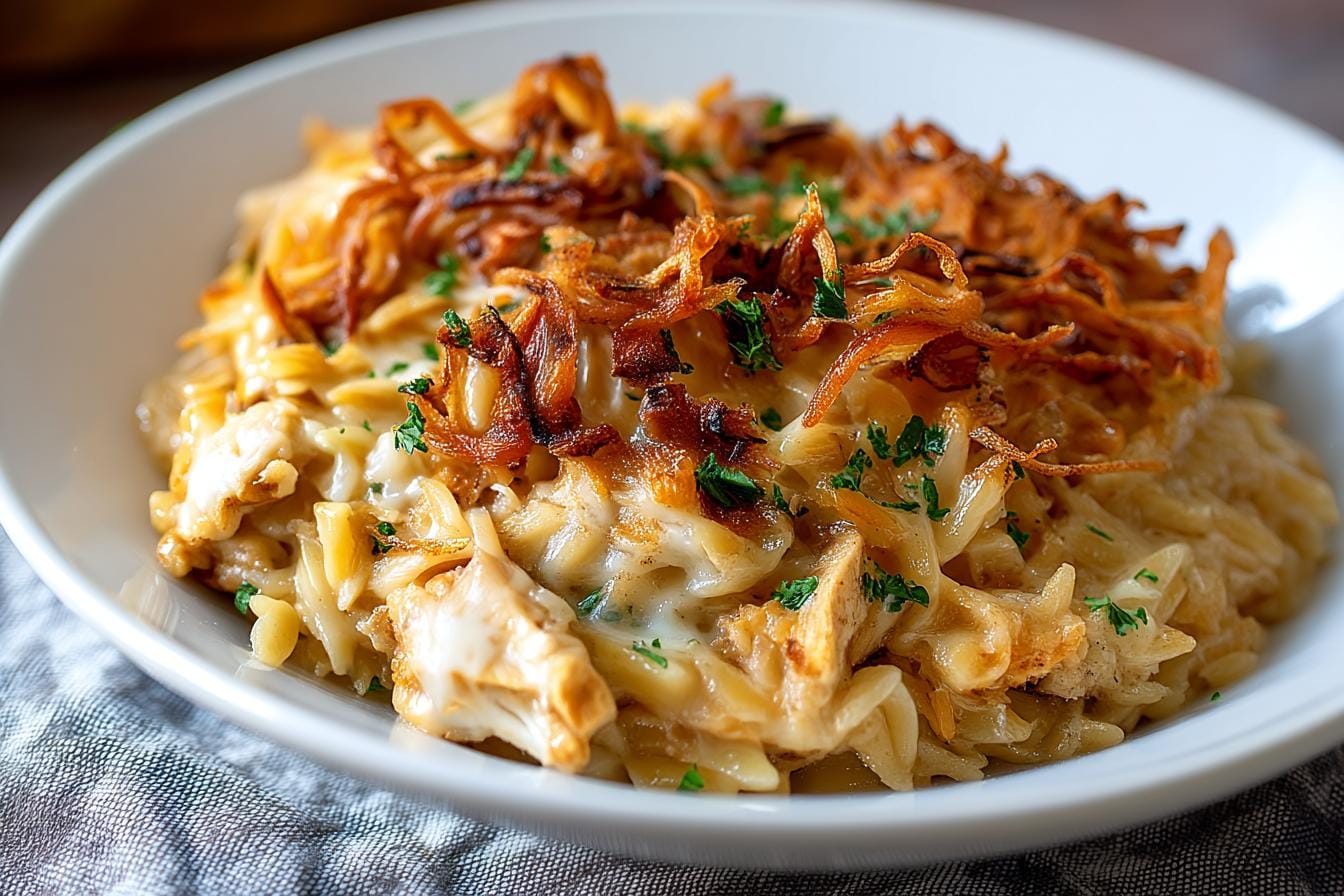 French Onion Chicken Orzo Casserole
