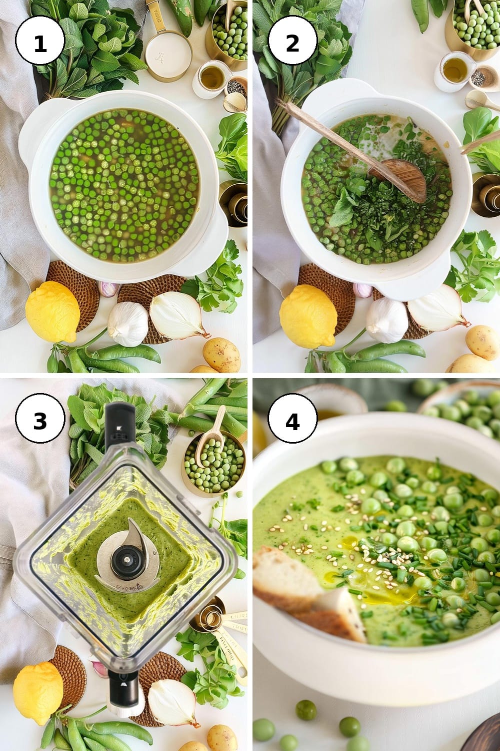 - Fresh Peas: the star of this soup, lending a sweet, crisp flavor; you can use frozen if fresh aren’t available.