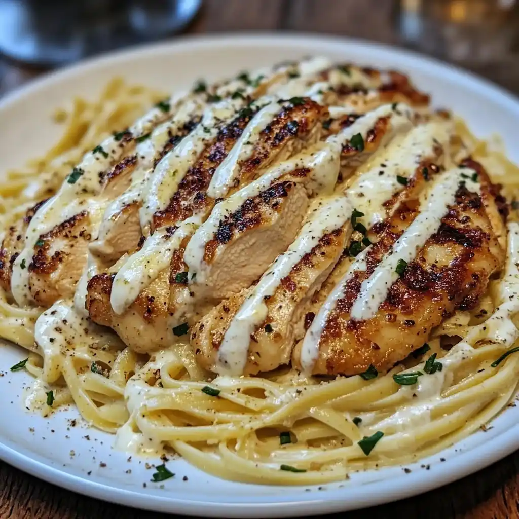 - Plate pasta and top with sliced chicken. Garnish with parsley and serve.