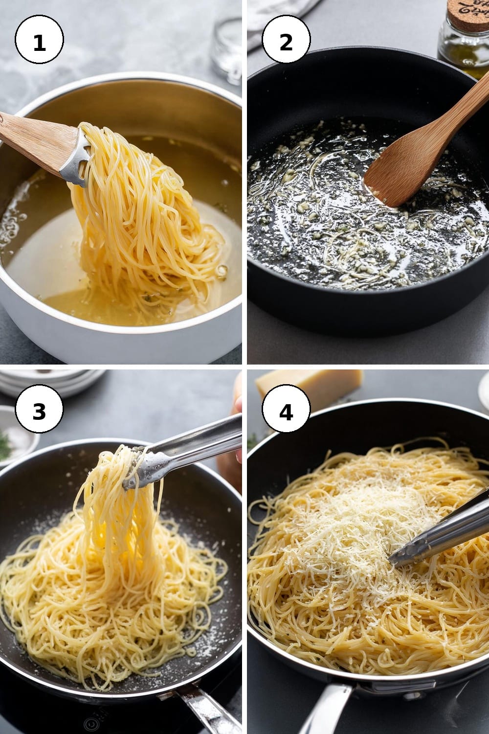 - Add the cooked pasta to the skillet and toss with kitchen tongs. Stir in the Parmesan cheese and toss so the cheese melts. Add some of the pasta water (a couple of spoonfuls at a time) and the remaining tablespoon of butter. Toss, adding more pasta cooking water until the pasta is glossy and coated. Most likely, you won’t need all the cooking water.