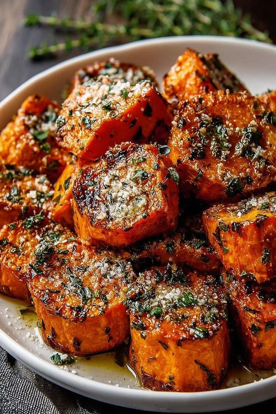 These Garlic Parmesan Roasted Sweet Potatoes pair wonderfully with roasted chicken, grilled steak, or a simple green salad. They also make a tasty addition to grain bowls, tacos, or holiday plates — serve hot for best texture and flavor.