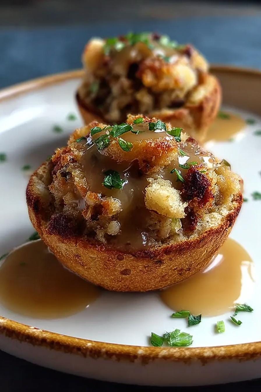 These Gravy-Stuffed Stuffing Muffins deliver warm, savory comfort in every bite. Crispy browned edges give way to a soft, herb-scented center that hides a pool of rich, steaming gravy — the kind of treat that turns ordinary weeknights into cozy celebrations. Ideal for beginner cooks, the process is straightforward and forgiving: mix your stuffing, press it into a muffin tin, add gravy, bake until golden, and serve hot.