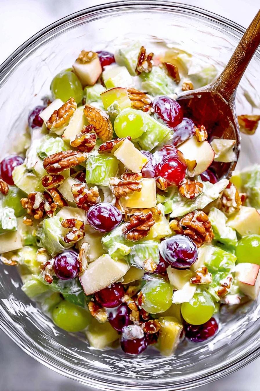- Add 2 chopped red-skinned apples, 2 green-skinned apples, 1 cup diced celery, 1 cup halved seedless grapes, ½ cup toasted walnuts, and ½ cup dried cranberries. Gently toss until every piece is coated—listen for a soft rustle as fruit and nuts mingle.