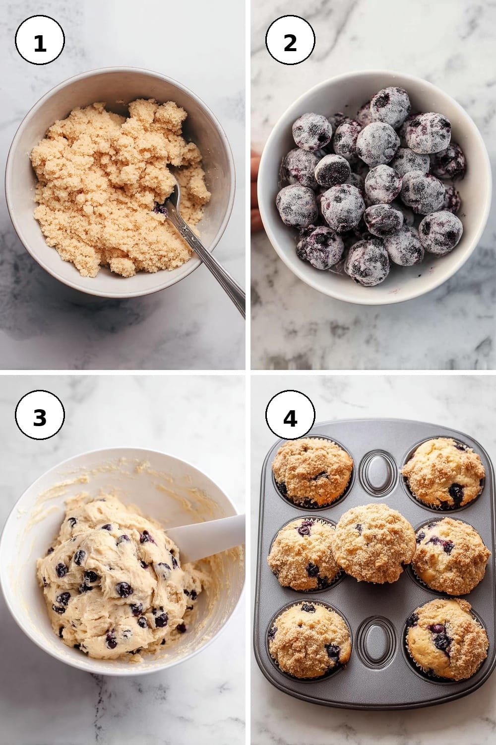 - If using frozen blueberries, dust them with about 1/2 tsp flour first. Add the blueberries to the batter and finish folding until the blueberries are evenly incorporated and there are no more dry pockets of dry flour in the batter. It’s okay if it’s lumpy, just make sure to avoid over stirring.
