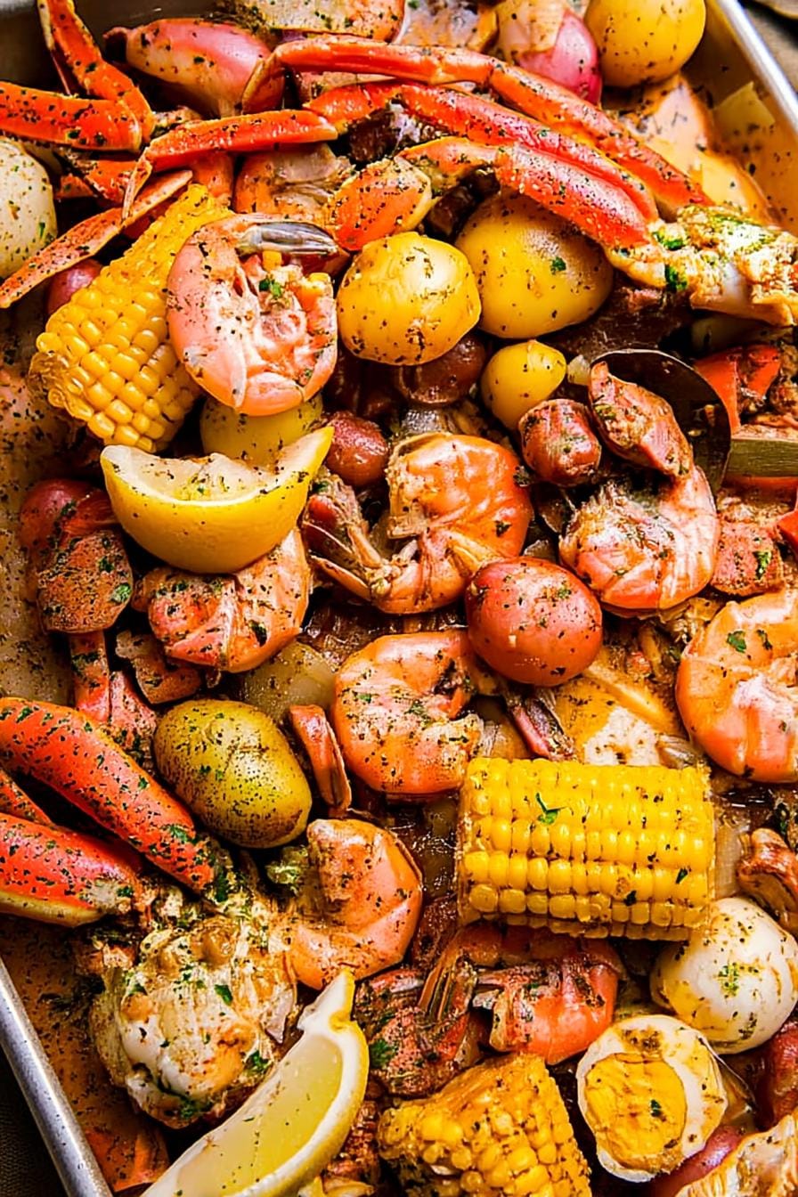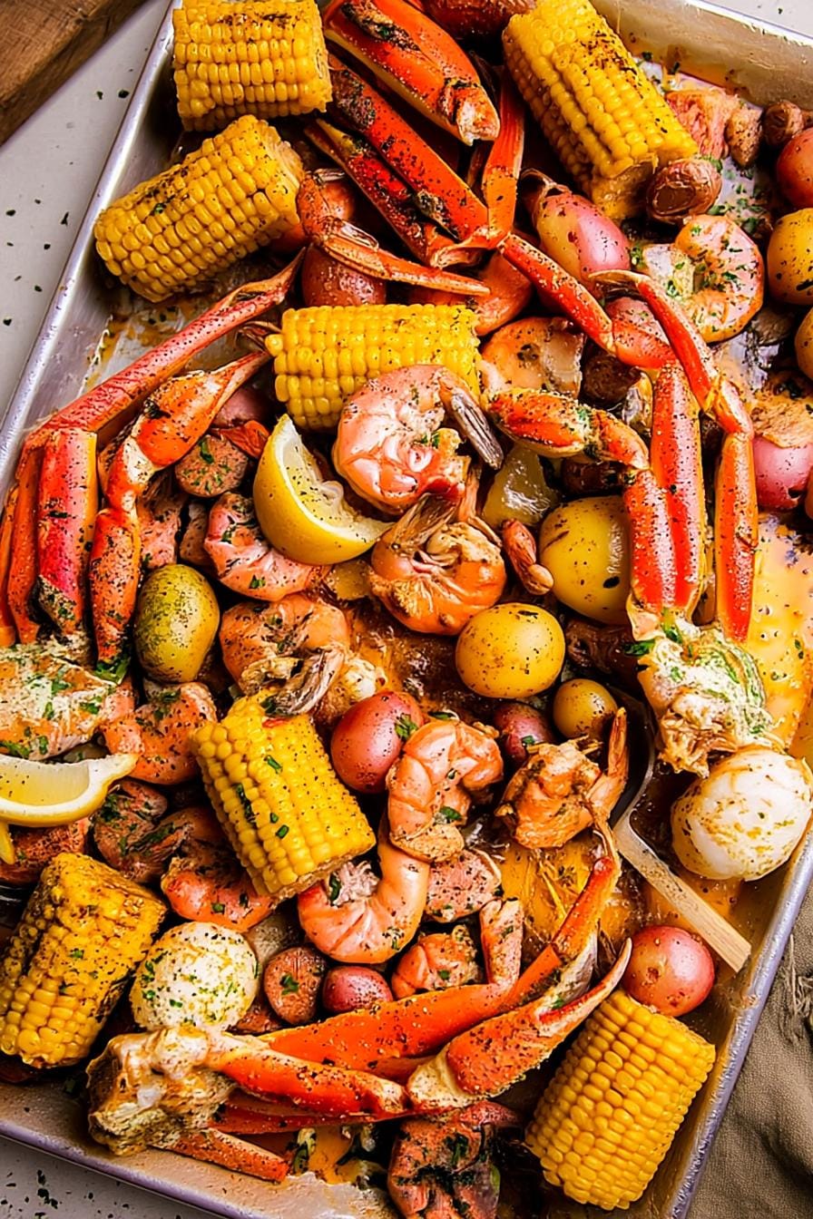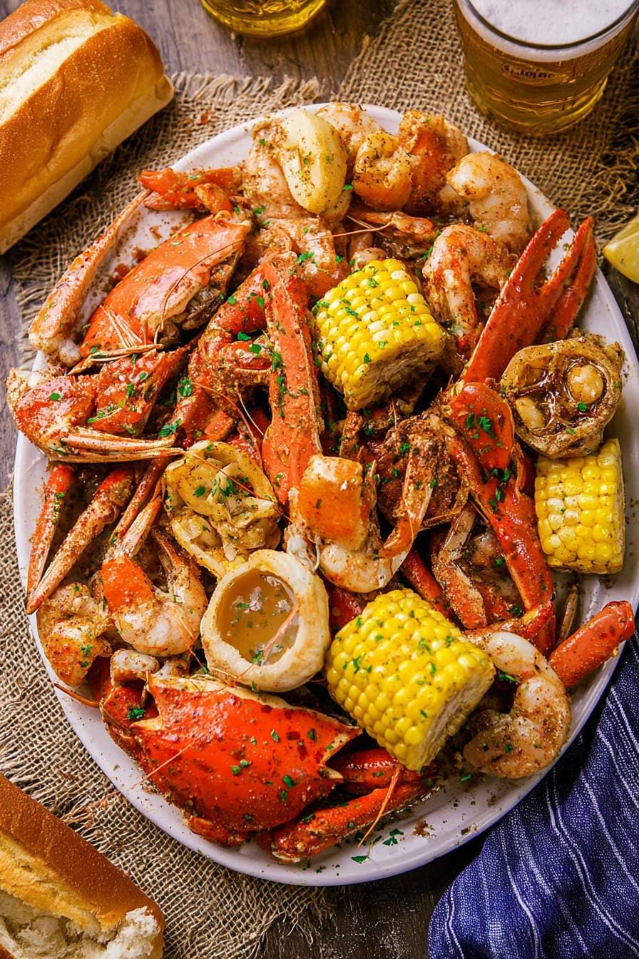 Spread newspaper on the table, pile the boil high, and pass bowls of lemon wedges, extra garlic butter, and crusty bread. A crisp green salad or buttery dinner rolls round out the feast.