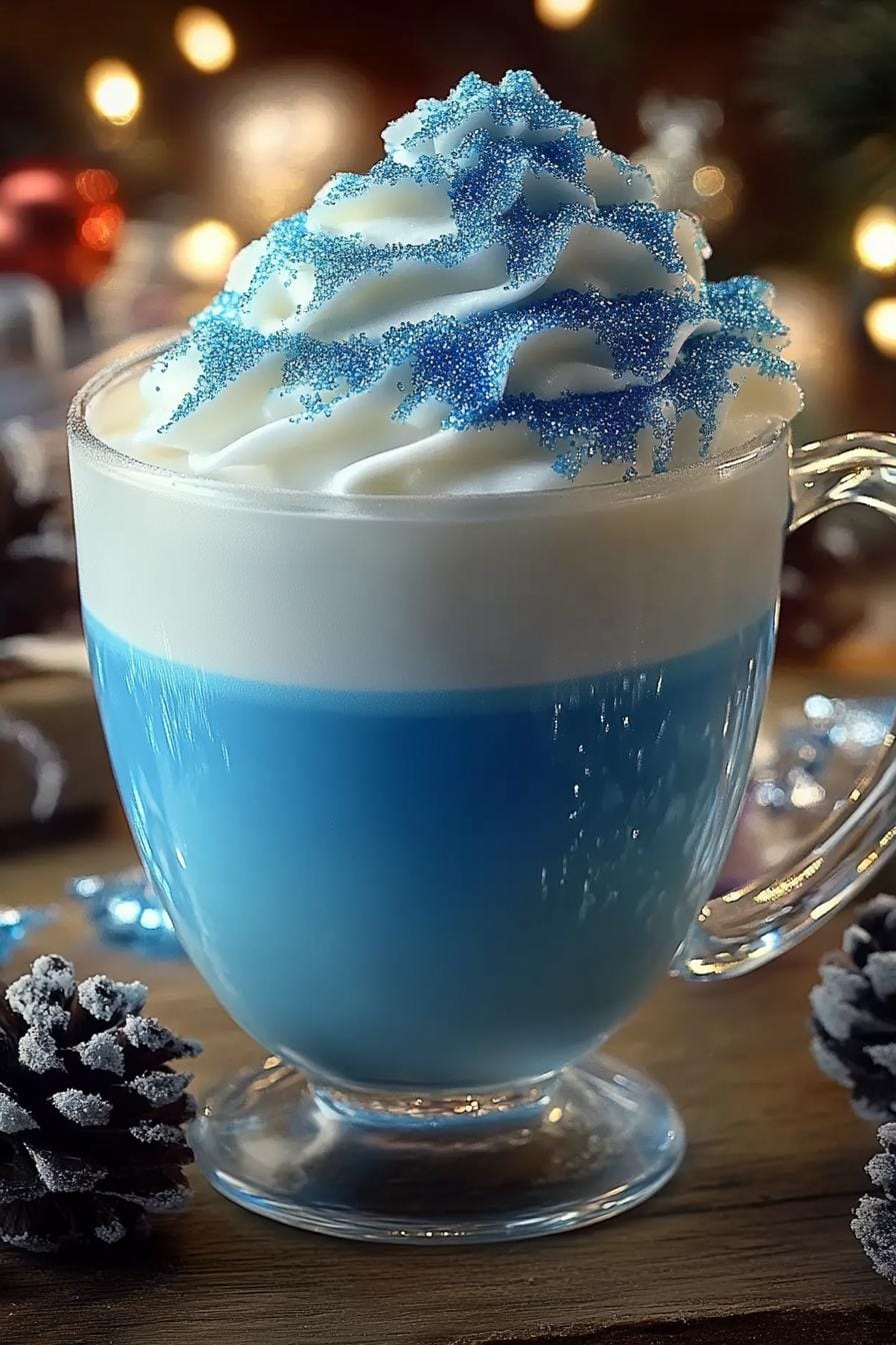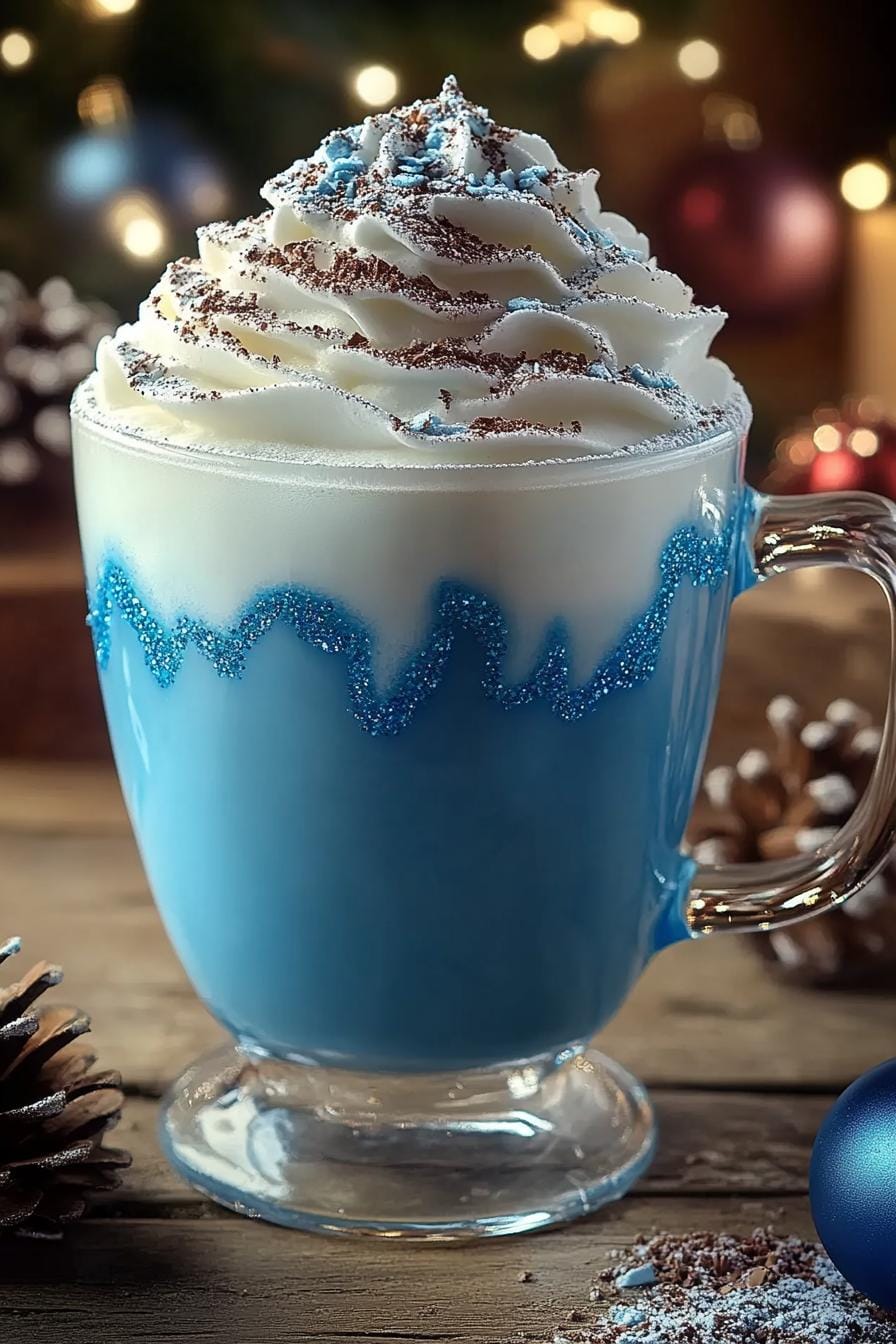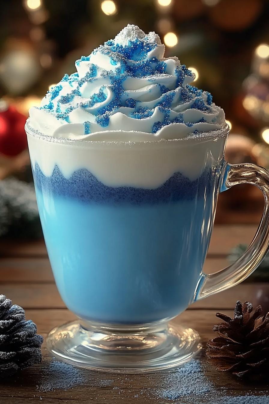 Top with a swirl of whipped cream and a sprinkle of blue sanding sugar. A few white marshmallows or a star-shaped cookie on the rim make it feel extra festive. Pair with buttery shortbread for contrast.