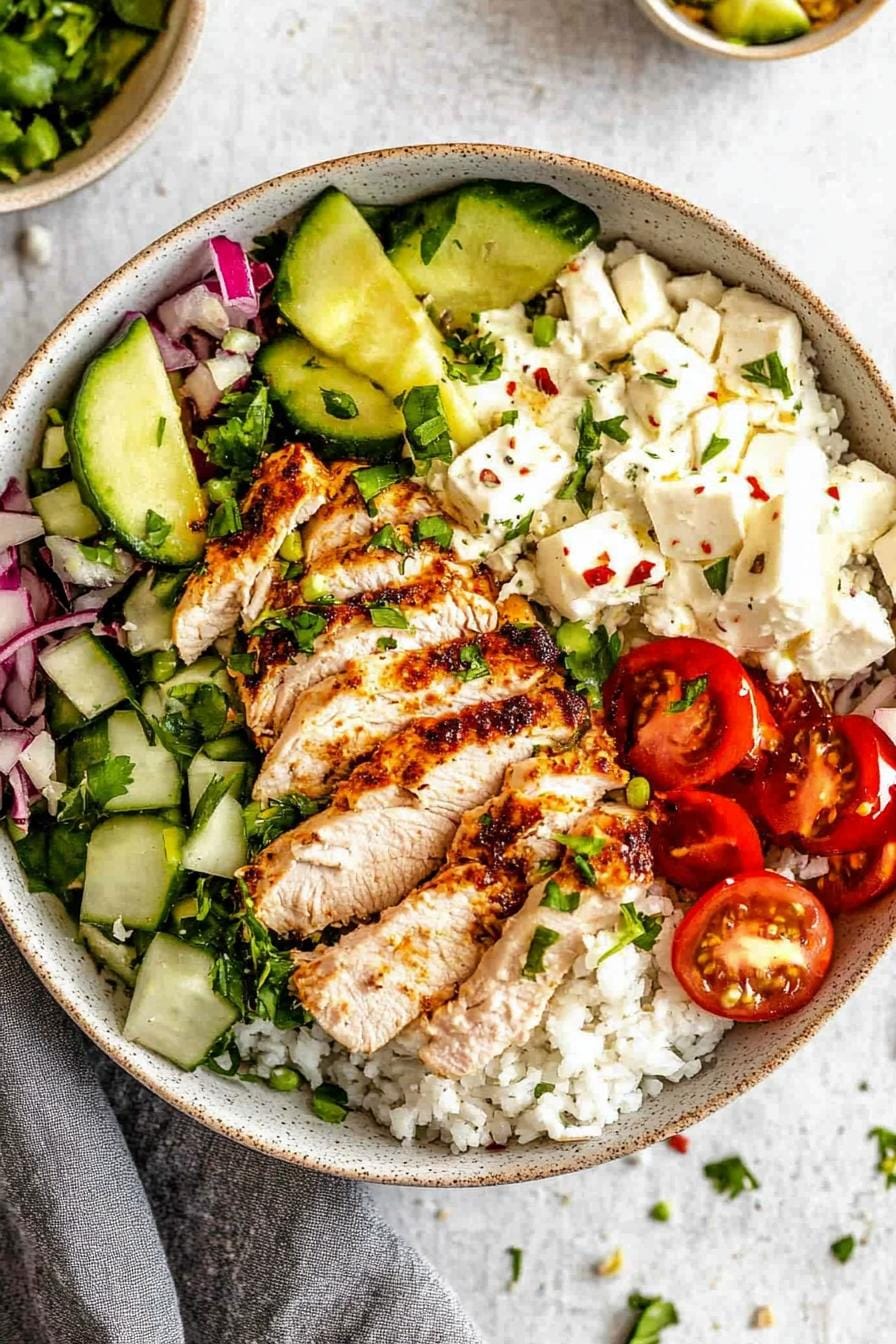 - Assemble the bowls: Divide rice among bowls. Top with chicken, 1 cup halved cherry tomatoes, 1 cup diced cucumber, ¼ cup thinly sliced red onion, ¼ cup sliced Kalamata olives, and ¼ cup crumbled feta. Drizzle each with 2 tbsp lemon-olive oil dressing (juice of 1 lemon whisked with 2 tbsp olive oil, salt, and pepper).