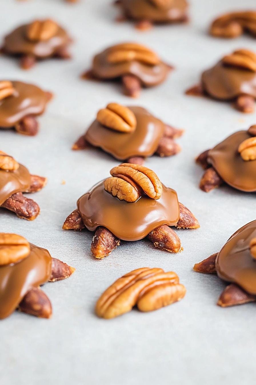 Arrange these treats on a festive platter alongside coffee or espresso for a crunchy-sweet pairing. You can also nestle them in mini cupcake liners as edible favors, or chop coarsely and sprinkle over vanilla ice cream for instant turtle sundaes.