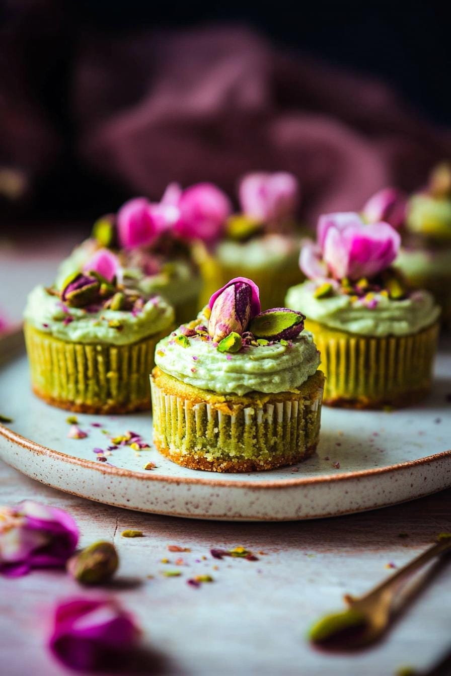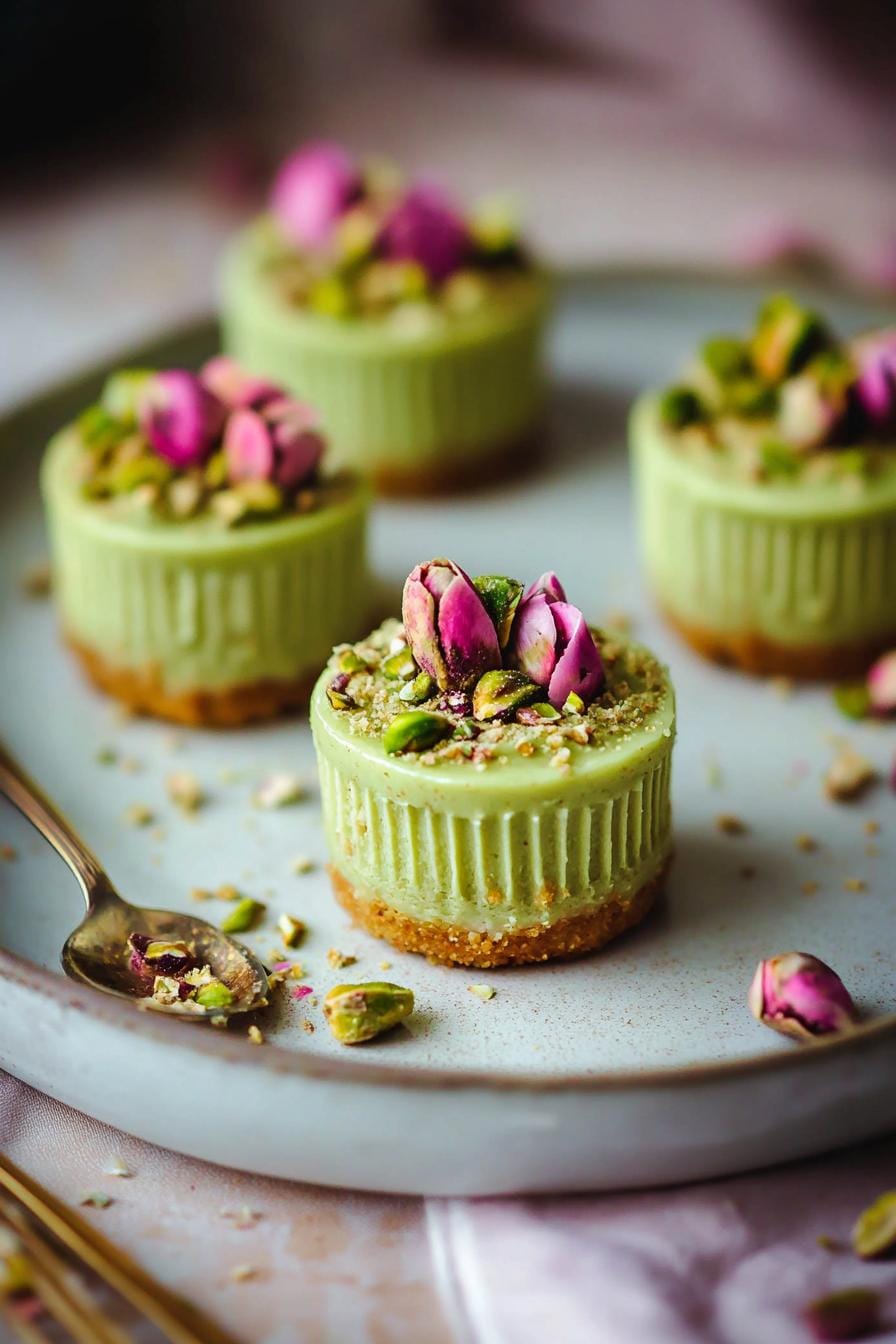 Arrange Mini Pistachio Cheesecake on a platter with a drizzle of honey, a sprinkle of chopped pistachios and a few fresh berries. They pair wonderfully with a bright espresso or a lightly sweetened green tea.