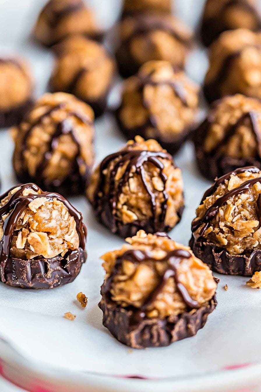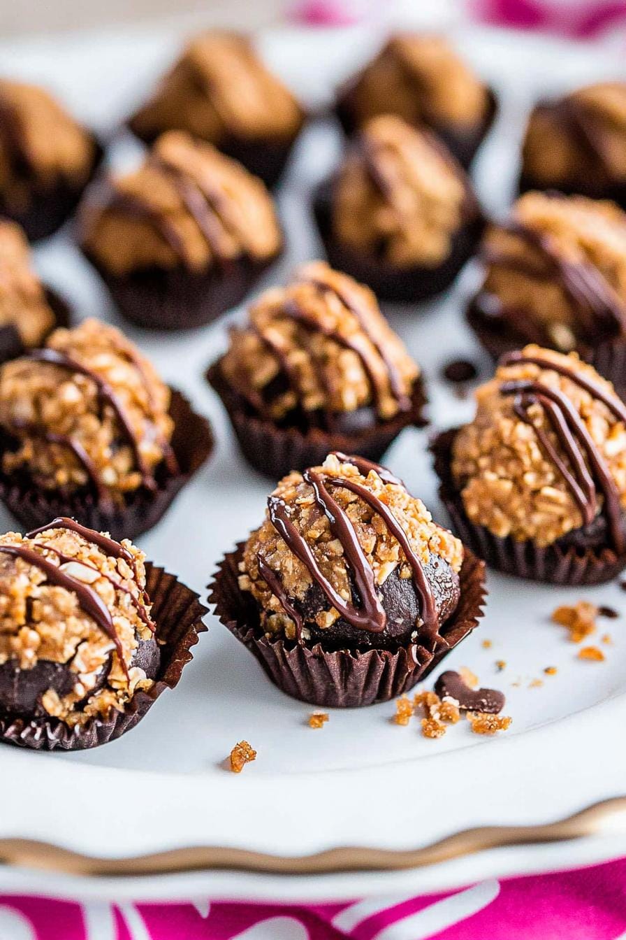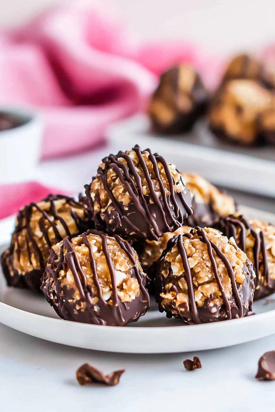 Keep Samoa Truffles in an airtight container in the fridge for up to one week or freeze for three months. Thaw in the fridge for 2 hours, then rest at room temperature for 10 minutes before serving. Always refrigerate within 2 hours of assembly to maintain food safety.